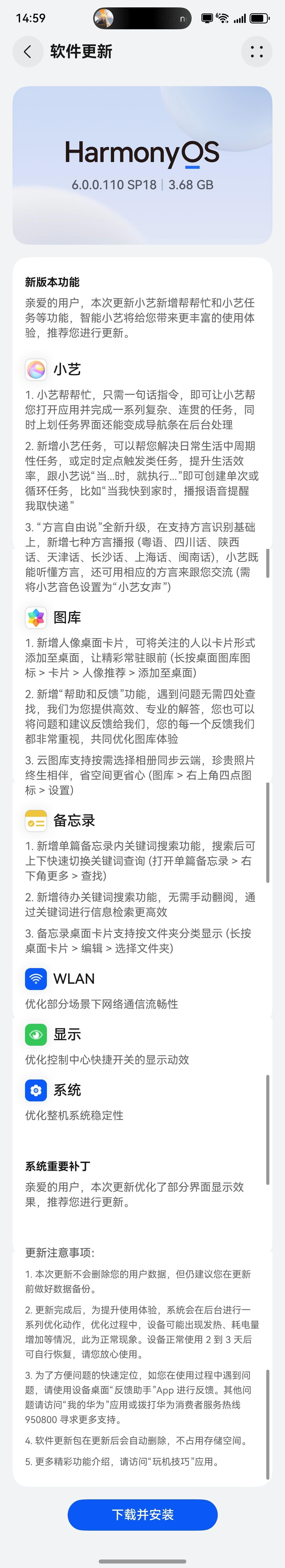 鸿蒙 6.0.0.110(sp18)来了,本次更新内容3.68GB看来底层的东西还真是不少,这次主要更新智能小艺帮帮忙、支持方言对话交流,新增图库人像桌面卡片,备忘录搜索,快捷开关显示动效等等,正在加急分批推送中,目前只有pura80ultra收到了,其他的还得耐心等待一下[比心]