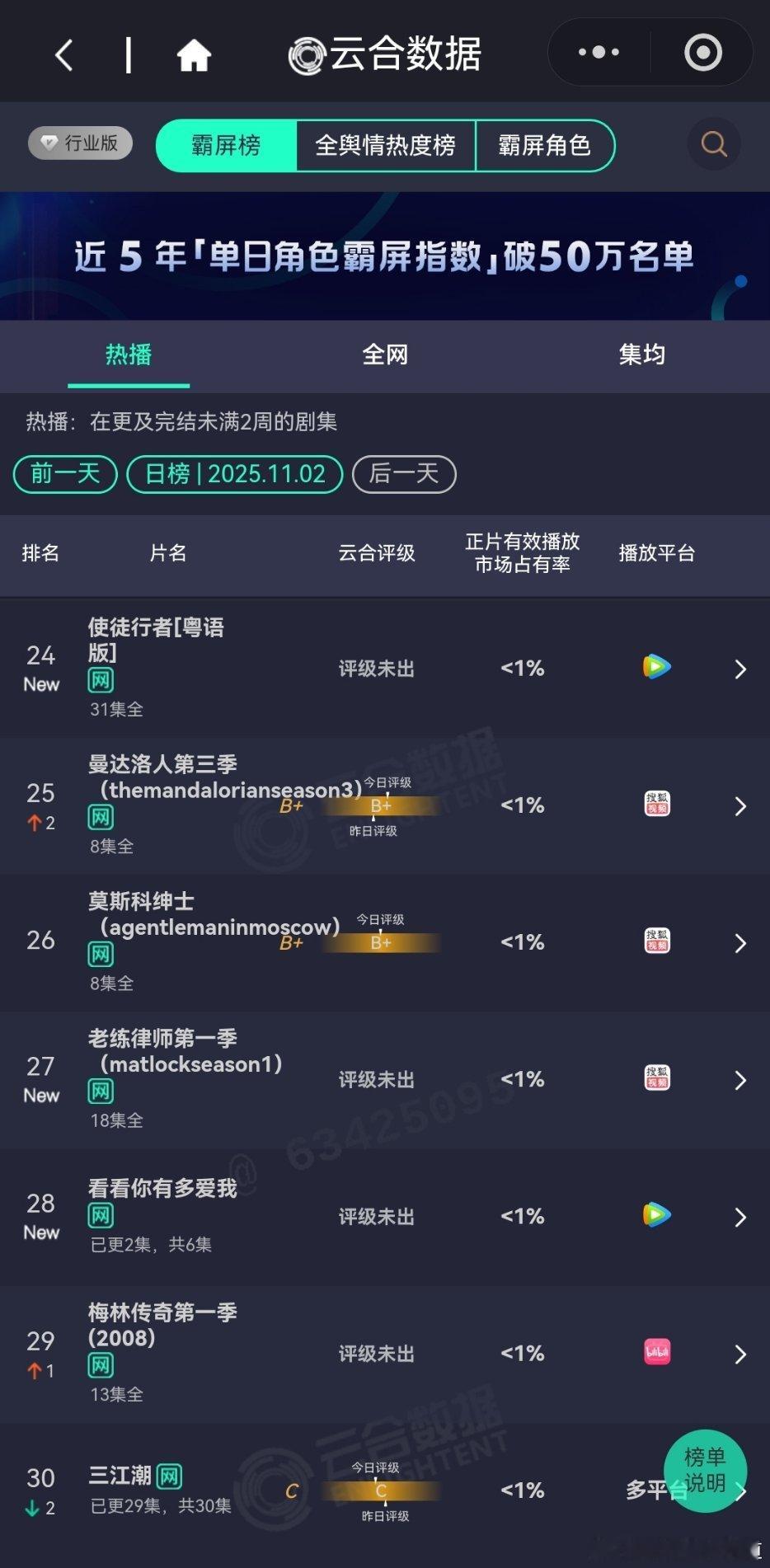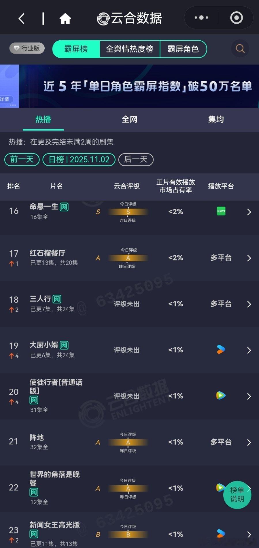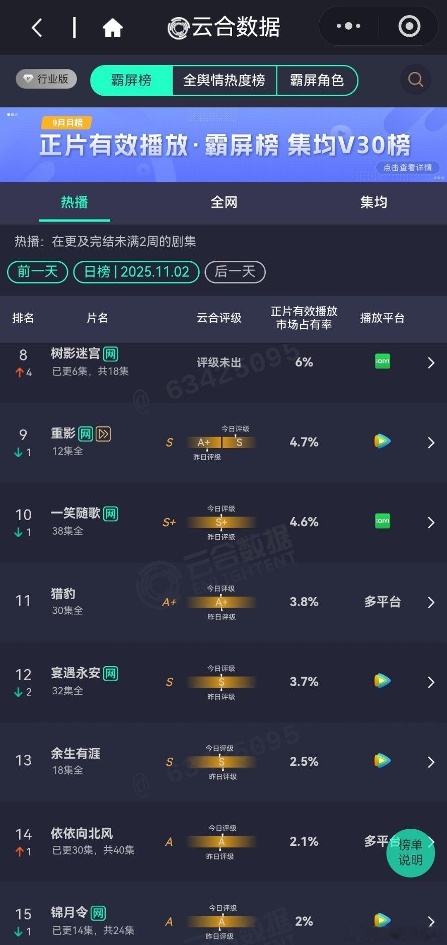 11月2日云合播放占比云合暗河传12.1%恭喜暗河传云合登顶天地剑心11.9%