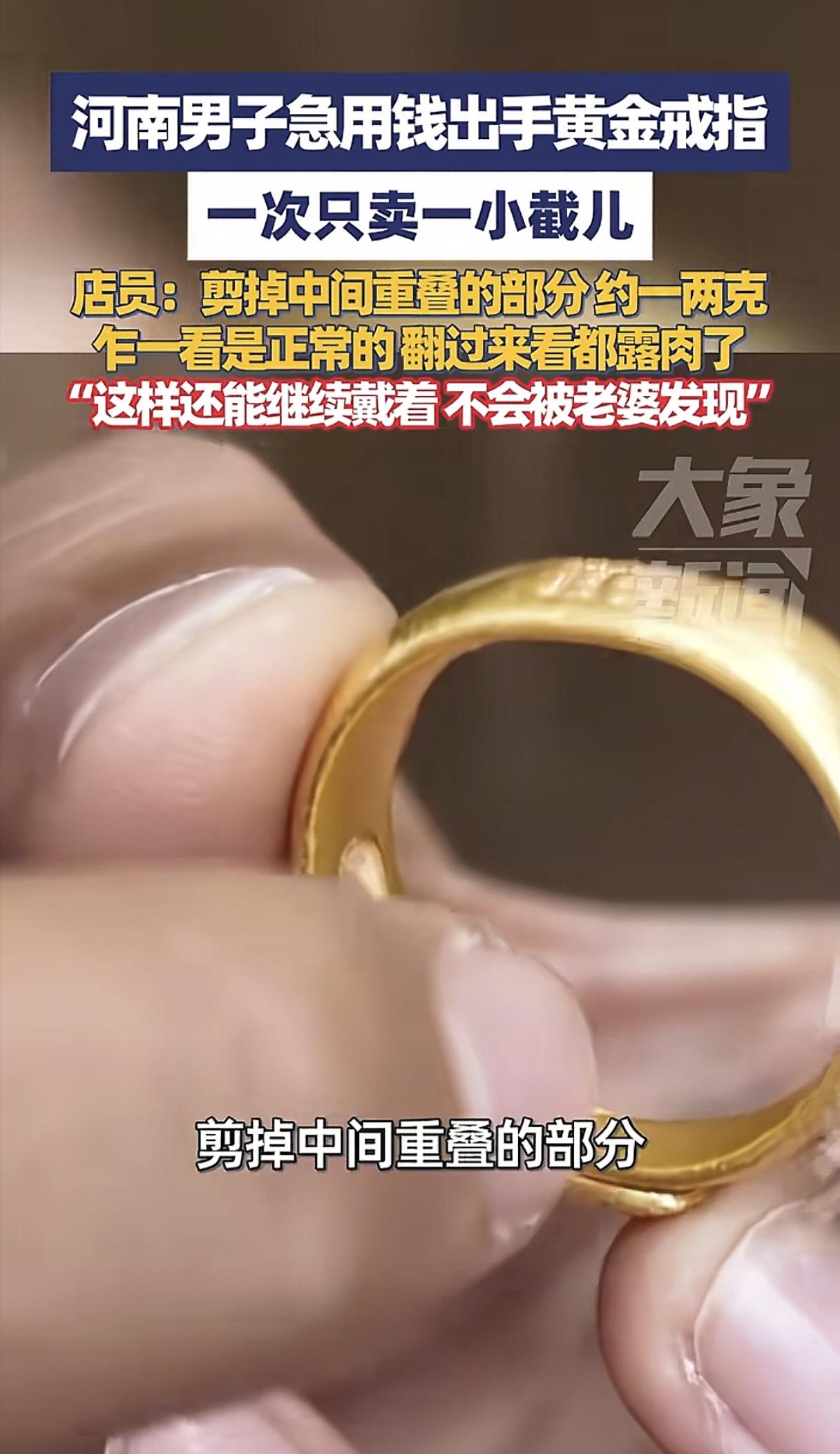 这男子蛮老婆有大招!河南郑州一男子急需用钱,便想把戒指卖了,但又不能被老婆发现,于是他对工作人员说:“兄弟,我能不能只卖一点?把戒指活口重叠部分的一两克剪下来卖了”。 工作人员讲诉,有一个大哥找上门,称急需用钱,问能不能把戒指中间活口部分剪下来卖了?这么做是为了不让老婆发现,剪掉之后戒指还能正常戴。 工作人员说:收了这么久的黄金,第一次听说,卖黄金还能卖一截的。 不久后,这个大哥又来了,店里工作人员一眼就认出他来了。 大哥说要再卖一点,工作人员怕再剪就不能戴了,连忙劝阻。 但大哥称没事,能带,虽然正面看是正常的,但是翻过来看都已经露肉了。 网友开玩笑:这下不光老婆知道了,丈母娘也知道了。