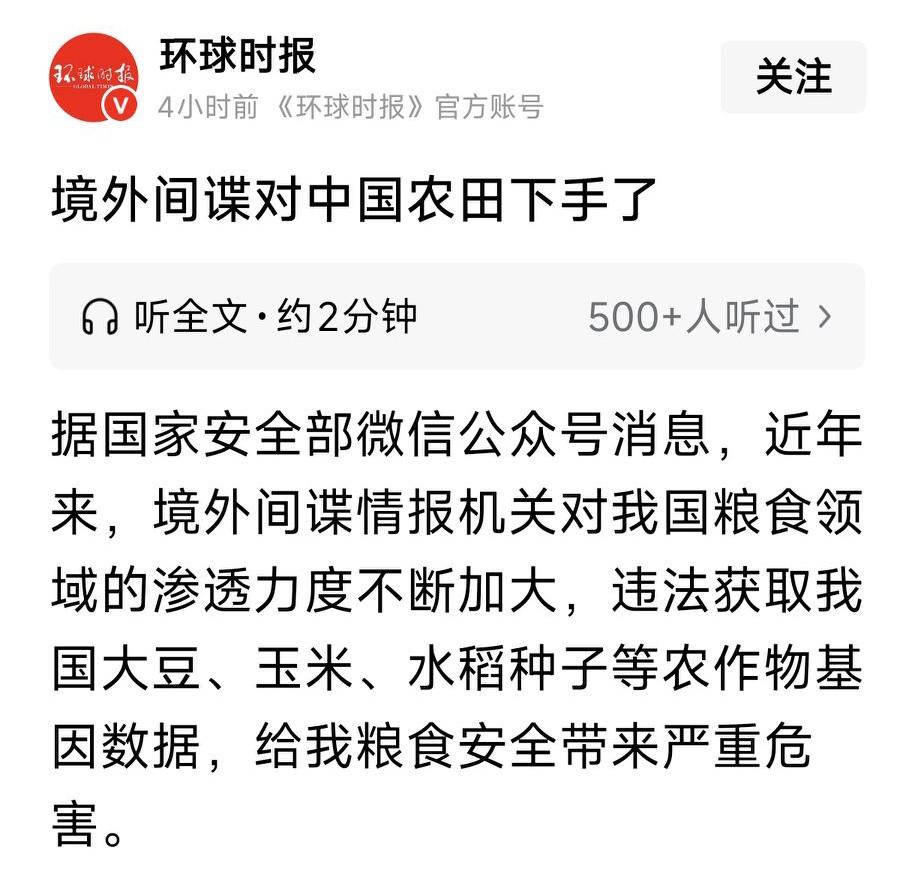 不得了!境外间谍真把手伸向咱中国农田了,大豆、玉米、水稻这些种子的安全着实让人揪心。种子可是农业的“芯片”,种业安全和粮食安全、乡村振兴紧密相连。 近年来,境外间谍对我国粮食领域渗透不断加剧。像有间谍机关以高额报酬诱惑境内人员,企图获取严禁外售的亲本种子;还有外国领馆人员带专业团队,以“走访调查”之名探查农作物产量和储备。 不过咱也别慌,国安机关一直在行动,有违法的都受到了惩处。我们普通人也要提高警惕,守护好咱的种子安全。 间谍