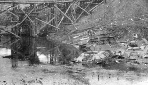 1941年7月7日森诺战役的第二天,苏联西方面军第20集团军第7机械化军第14坦克师向白俄罗斯维捷布斯克以西约33公里处的切尔诺戈斯蒂村发动进攻,第27坦克团的一辆BT-7和两辆T-34在试图徒涉切尔诺戈斯特尼察河时淤陷并最终损失。 现在的一些研究认为1941年7月6日至10日间的森诺战役爆发了战争中最大规模的坦克战,苏联第5和第7两个机械化军投入了约1000辆坦克,而与之对阵的德国第三装甲集群也拥有大致相同数量的坦克,规模超过了官方宣称的普罗霍夫卡坦克战(双方合计1500辆)。 根据第14坦克师师长伊万·德米特里耶维奇·瓦西里耶夫上校的报告,7月7日该师出动了包括11辆KV-1和24辆T-34在内的126辆坦克,损失率超过50%,25辆坦克因在敌控制区损失而无法回收,包括第27坦克团团长、T-34营营长和营政委在内的200余人阵亡。