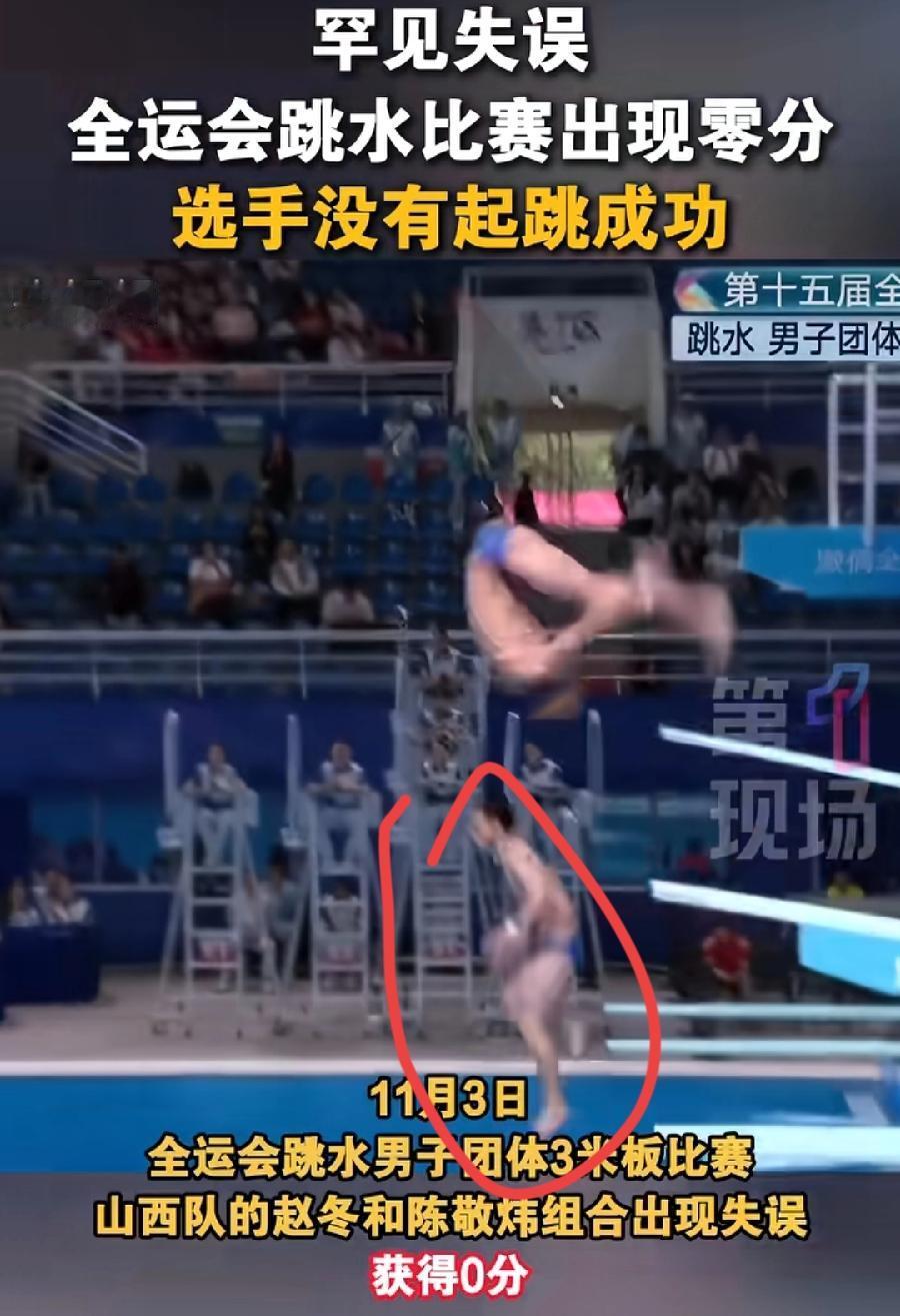 全运会跳水,山西男子组合0分!赵冬、陈敬炜组合,赵冬直接掉水池里了!起跳落板时,疑似脚底打滑,踩到跳板边缘上了,失去平衡,直愣愣地站立着掉下去了,直接炸鱼,在水里一团大水花!比赛没完成,直接0分,而队员陈敬炜表现非常完美,几乎水花消失术,被队友坑了!罕见低级失误,得了0分,隔着屏幕都感觉尴尬了!