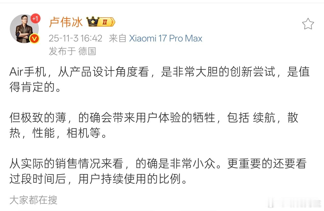 看卢伟冰这意思,小米暂时没有做Air的计划。正好这两天华为Mate70Air