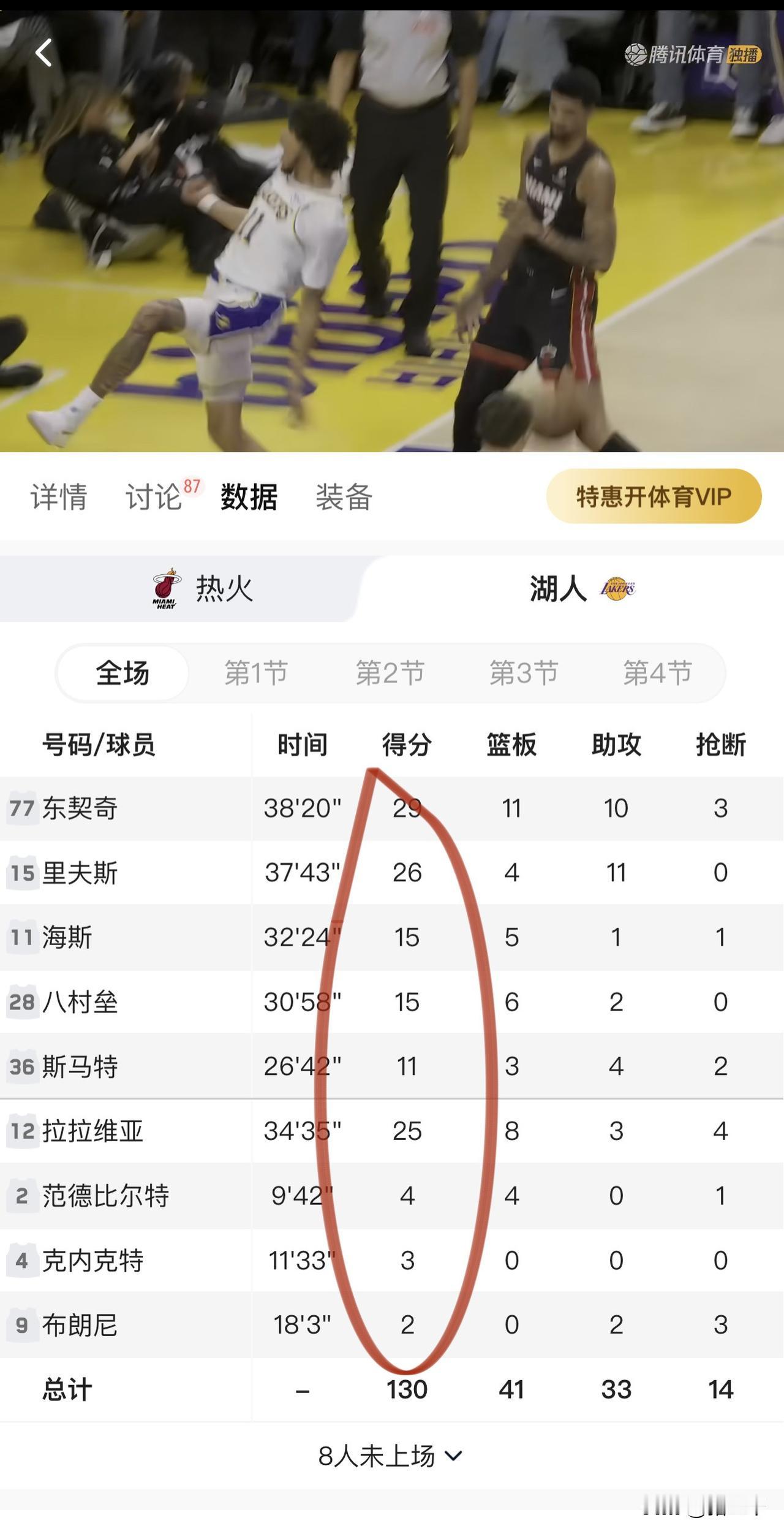 湖人今天表现太出色了! 上场球员填满数据栏, 6人得分上双! 新人拉拉维亚再次打出现象级表现! 詹姆斯儿子布朗尼也获得“showtime”, 里夫斯球打得好、情商还高, 给布朗尼送出空接暴扣成就今日五佳球。 詹姆斯和艾顿养伤, 文森特估计本赛季合同到期就被裁了, 今年是里夫斯和文森特的合同年, 文森特在季前赛有过带队超神表现, 作为球迷我们期待文森特能成就湖人冠军拼图。 湖人队今年换了老板, 球员们都在积极表现, 球队经营管理层没什么变化, 珍妮巴斯继续是ceo, 湖人经理人手段在NBA排前五问题不大! 湖人要是不从商业角度出发, 那拿出詹姆斯交易是最好的选择! 但显然球队是要赚钱的…