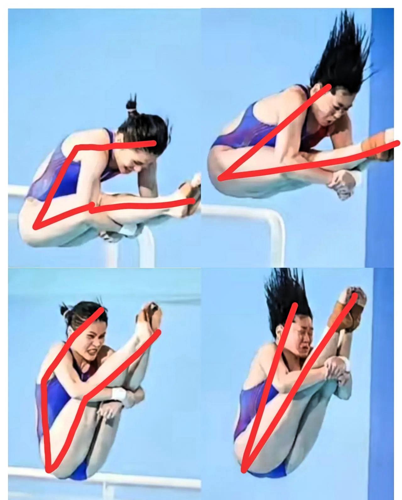 没有对比就没有发言权, 左边是王伟营,右边是全红婵 她和搭档王伟营的训练画面放一起,哪有什么“天生水花消失术”,全是她把每个动作练到极致的结果。 仔细看婵宝的入水姿势,不是普通的团身,而是把身体“折叠”得很规整。头贴紧后背,后背保持平直,腿和脚尖也绷成一条直线,全身没有多余的松懈,整个身体线条很紧凑。这样入水时接触面积小,水花自然就小。 再看旁边的搭档,不是不努力,是很难做到婵宝那样的规整。她也在尽力低头靠近腿,但身体线条没那么紧凑,有点像咱们上学体测坐位体前屈,老师让再往前,自己使劲凑却总差一点,那种“尽力了但没到极致”的状态,很多人都有过。 别总说婵宝是“天才”,她的成绩是练出来的。别人练动作追求合格,她会对着镜子抠细节,团身要更紧凑,脚尖要更直,每个小地方都不放过。这不是天赋差距,是她比别人多了份“把动作做透”的认真。 咱们普通人做事也一样,没那么多天生厉害的人,大多时候差的就是这份“抠细节”的劲头。不是做不到,是没像婵宝那样,把简单的事反复打磨到最好。