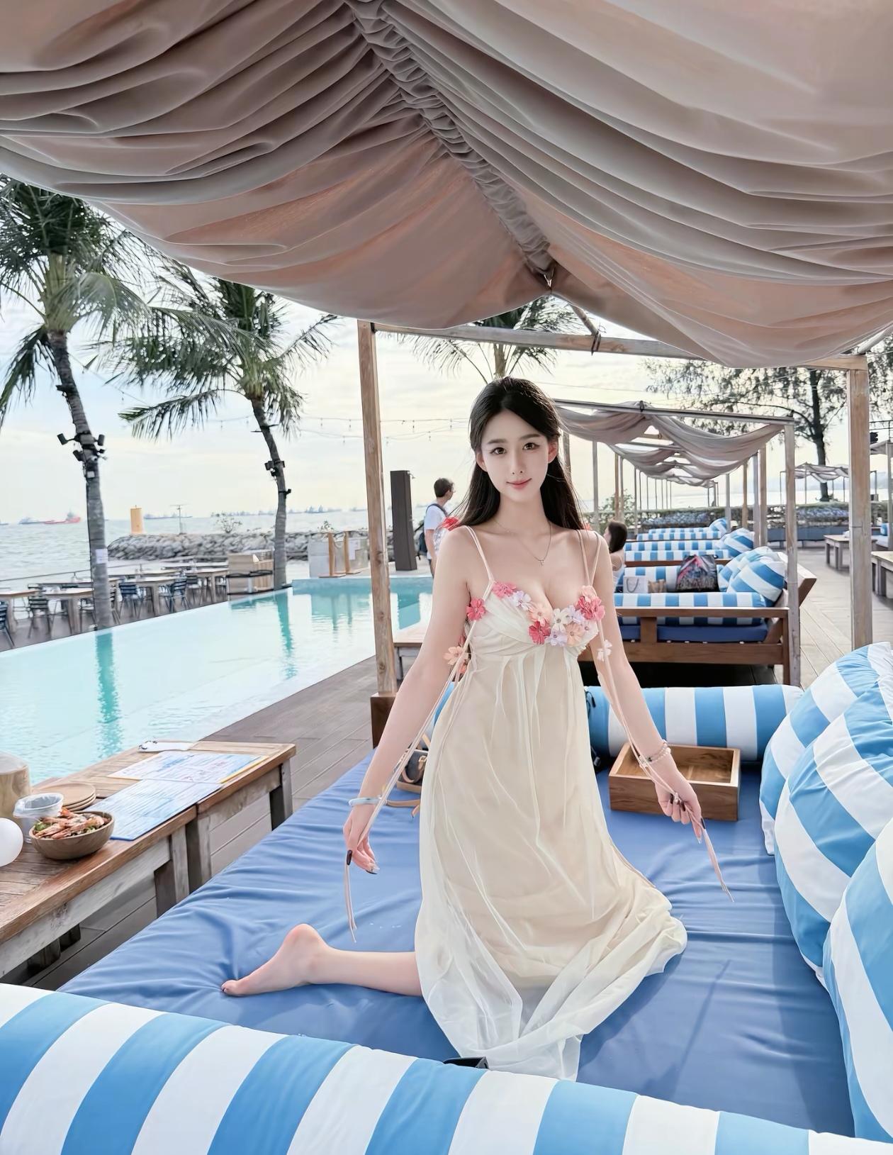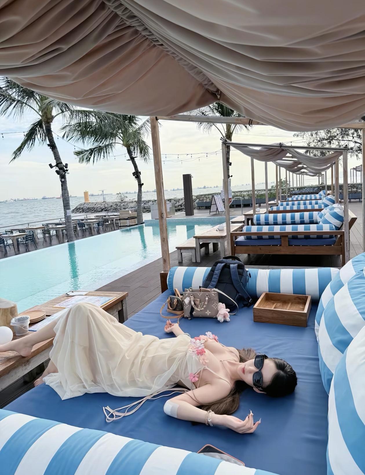 海边度假的惬意时光,躺在舒适的躺椅上,享受阳光和海风。