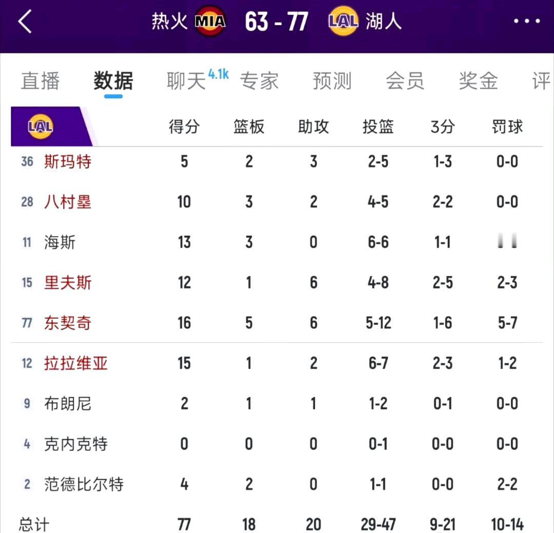很久没看到这么流畅的湖人了!詹姆斯的缺席反而让湖人进攻拉满,这一切都源于湖人内线优势明显。 海斯、八村、拉拉维亚,就像是大核手中的千机盒,你根本不知道他下一个掏出来什么兵器,而且把把趁手,把东子都玩嗨了。 东子不在的时候,里夫斯带队赢球有点艰难,东子回来了,湖人赢球就简单多了。 好比今天的热火,对面把体型和提速拉满,竭尽全力半场63分,结果发现还落后14分……这种进攻能力,感觉太陌生了。