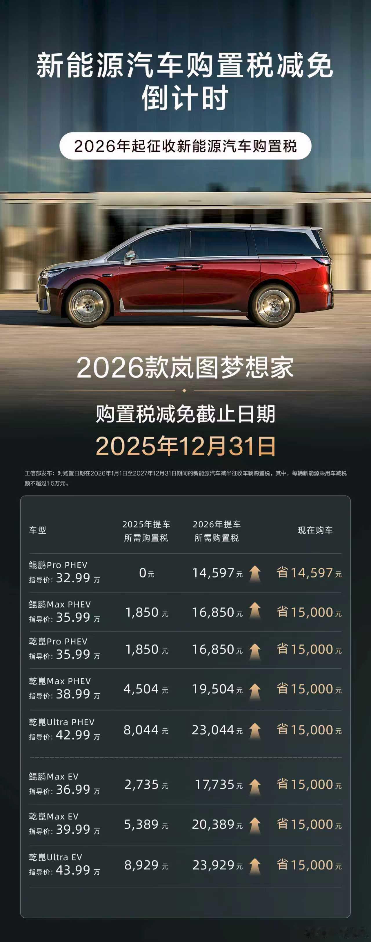 别说我没提醒你,新能源汽车的购置税减免政策已经开始倒计时了!如果你在2025年底前购买岚图梦想家,可以直接省下近1.5万元。这笔钱用来给自己添置新衣或给孩子买玩具,不是更划算吗?
