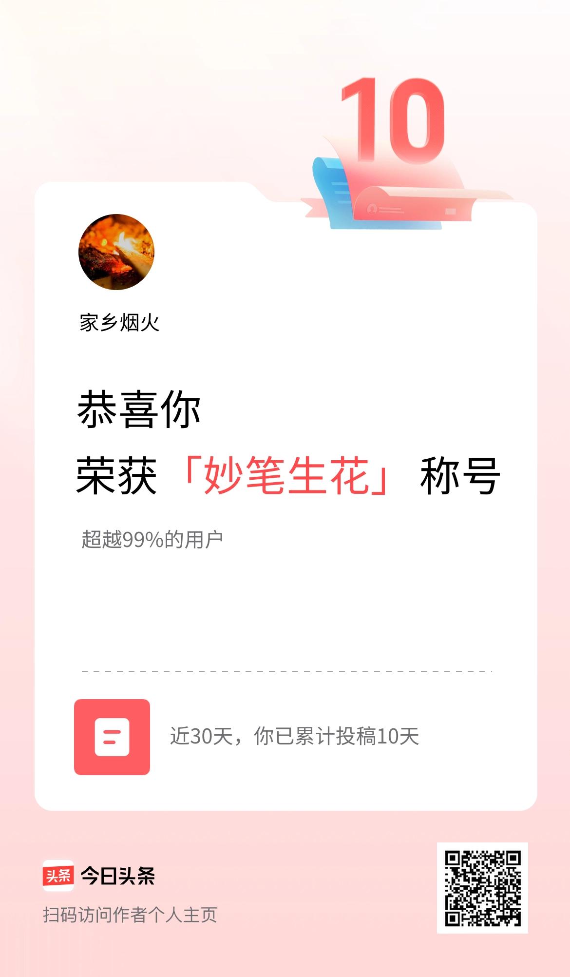 我在头条30天内投稿打卡10天,获得“妙笔生花”称号
