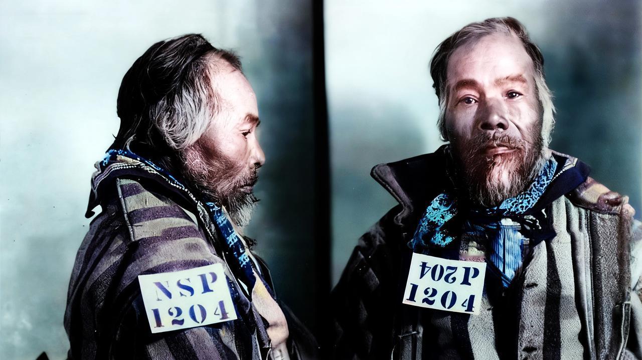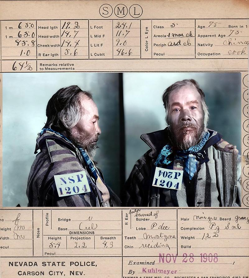 这两张照片拍摄于 1908年11月28日的美国内华达州立监狱,画面中的男子叫方旺,身份是一名厨师,1820年出生在中国。他还有一个英文名叫乔治・方 。 1894年10月4 日,他在美国内华达州东部的白松县用手枪射杀了一个叫李兴的中国人。照片中的方旺胡子拉碴,穿着肮脏的囚服,脖子上系着一条丝巾。在拍正面照时,他的神情颇为坚毅,但在拍摄侧面照时却显得很沮丧。此时,他已在这里服刑超过了十三年,他常念叨的一句话就是:自己可能会死在狱中,再也回不到中国故土了。 1915年10月26 日上午9时,已服刑20年零5个月的方旺在监狱内无疾而终,终年95岁。次日被安葬于内华达首府卡森城的常青公墓内。 如果没有这几张照片,谁会知道在一百多年前,曾有过这样一个人和这样一段故事呢。