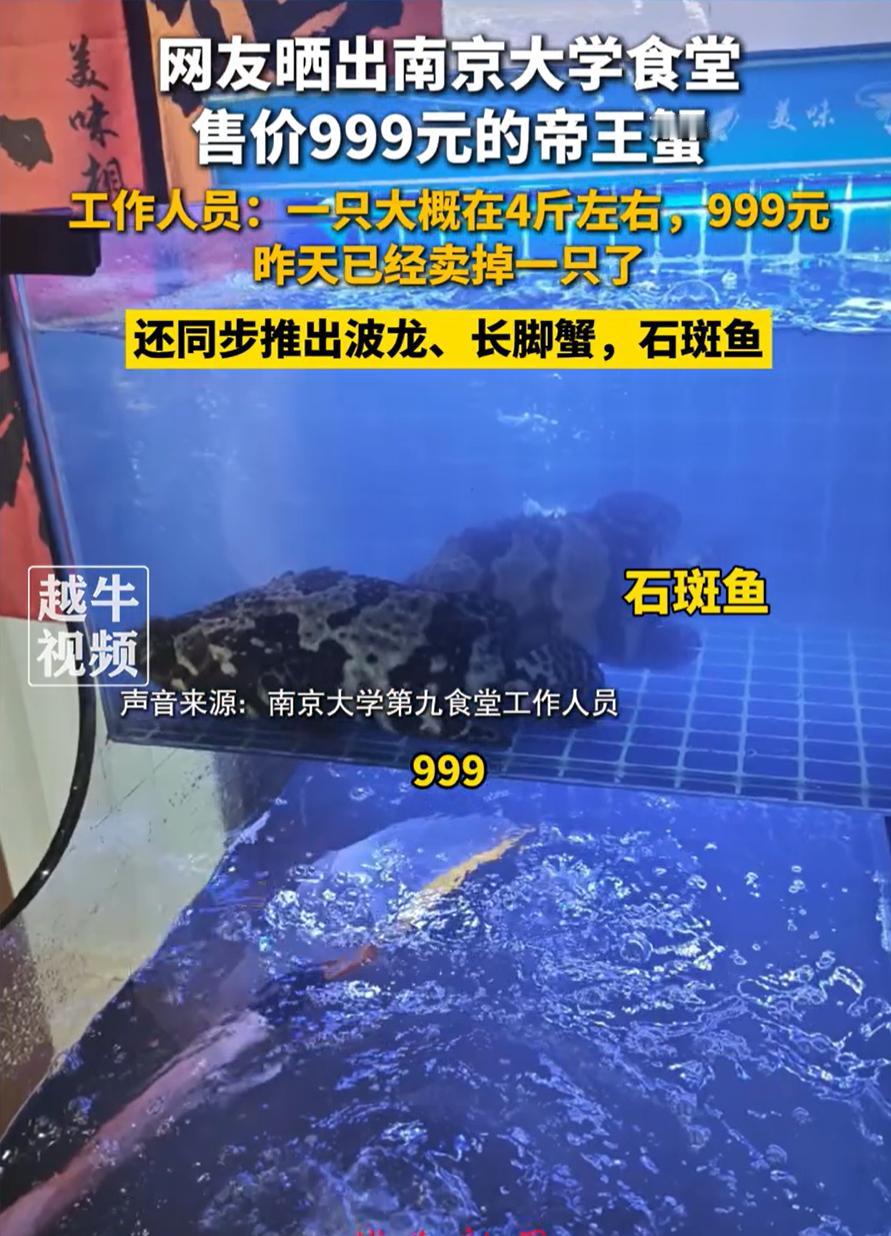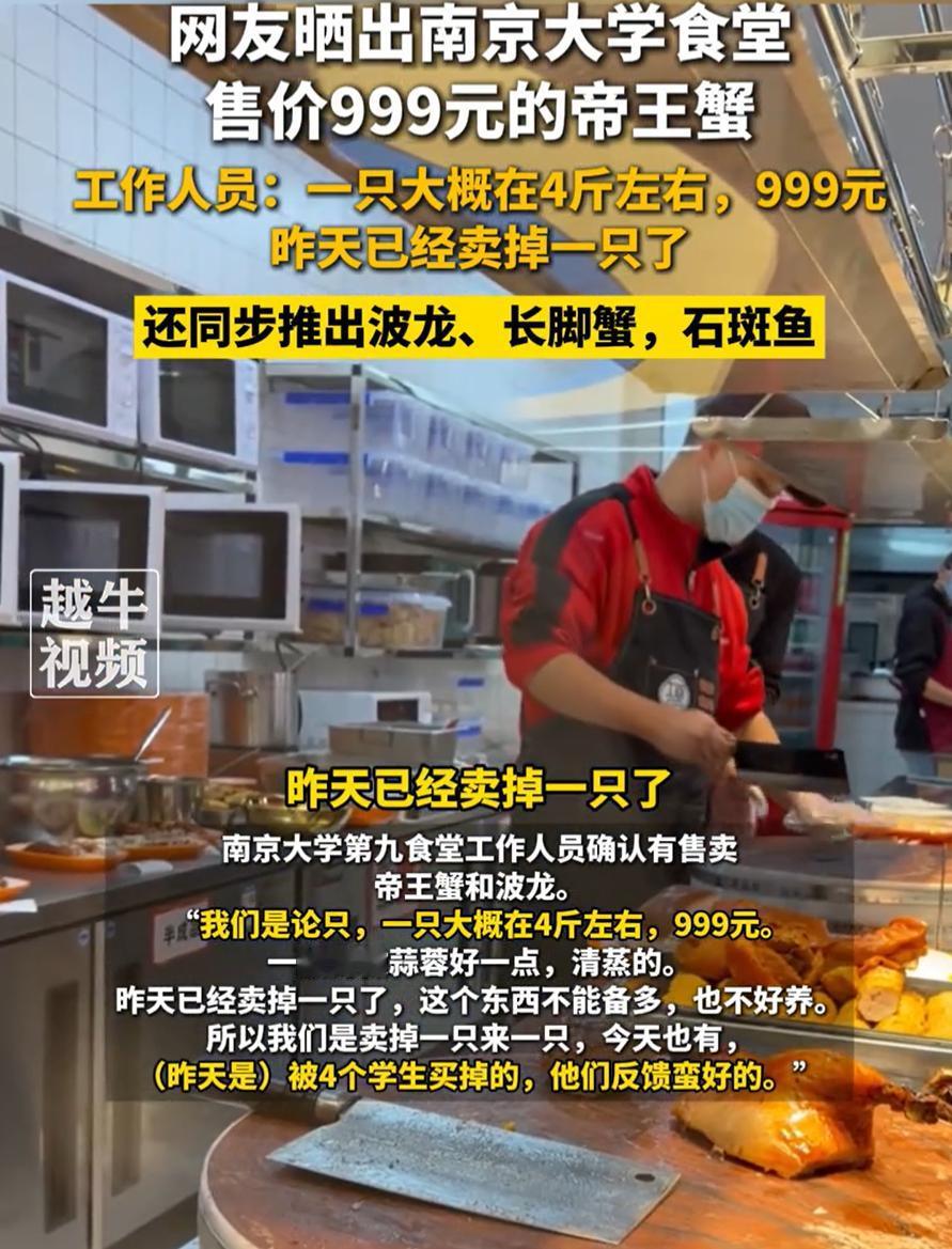 “太豪横了!”江苏南京,南京大学一食堂推出海鲜档口,这里不卖普通的炒菜米饭,帝王蟹、波士顿龙虾、石斑鱼一应俱全。帝王蟹一只卖999元,结果不仅没被劝退,反而天天有人排队预定,但这也引起了网友的争议,有网友说:这样做合适吗? 根据吃过的同学介绍,这个档口除了帝王蟹,还有158元一只的波士顿龙虾,68元一条的石斑鱼。当然,也保留了比较平价的选择,比如十块钱一个的生蚝,四十块一斤的沙虾。海鲜可以白灼、蒜蓉或者椒盐,做法挺全 而随着有同学做“第一个吃螃蟹的人”后,这两天销售情况火热,每天都有不少同学打电话询问预订事宜 不过也有网友觉得不妥:这不养成孩子攀比心啊,去学习的,不是去享受的,想吃好的,外面啥吃不到?非要在学校里装吗? 其实这件事挺有意思的,它不光是个“吃什么”的问题,更像是学校和学生之间的一种新关系。大学本来就是个包容多元的地方,学生的需求也各不相同,有人就想吃便宜的盖浇饭,也有人愿意偶尔奢侈一顿。学校能满足不同层次的需求,本身也是一种进步。关键在于,它没强制消费,也没把平价菜撤掉,学生有选择权,这才是重点 再说,帝王蟹999元听着贵,可真算下来,四五个同学拼着吃,也就一人两百来块,比去外面饭店便宜多了。对一些留学生、研究生或者已经在实习赚钱的学生来说,这种偶尔改善生活的消费并不稀奇
