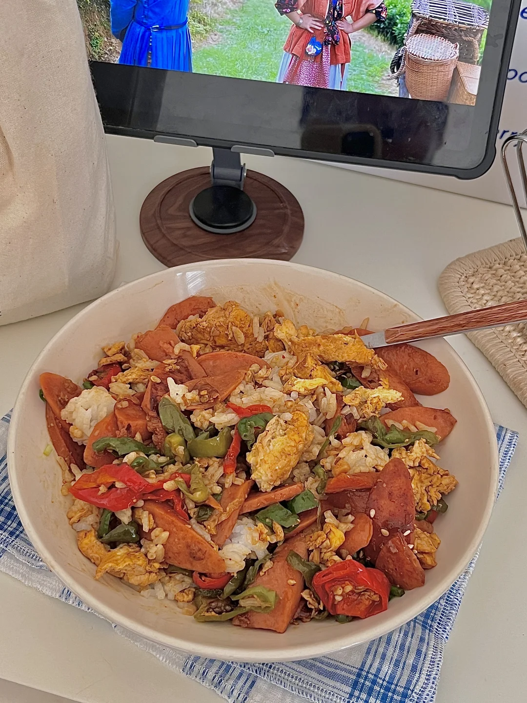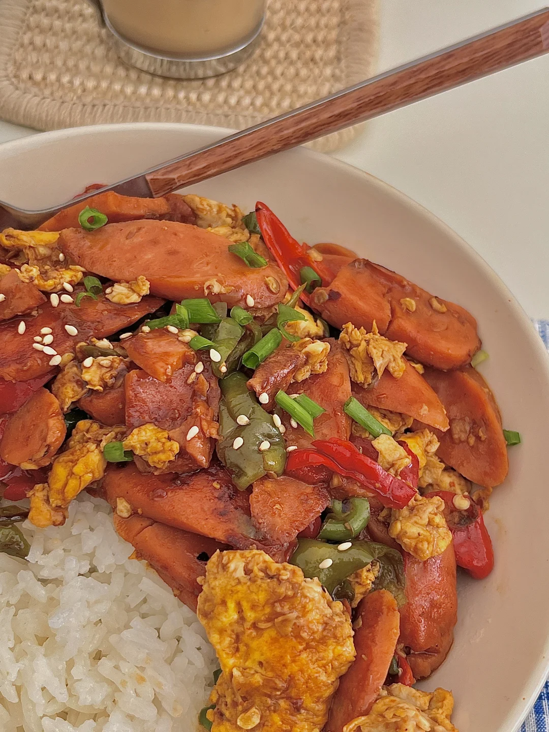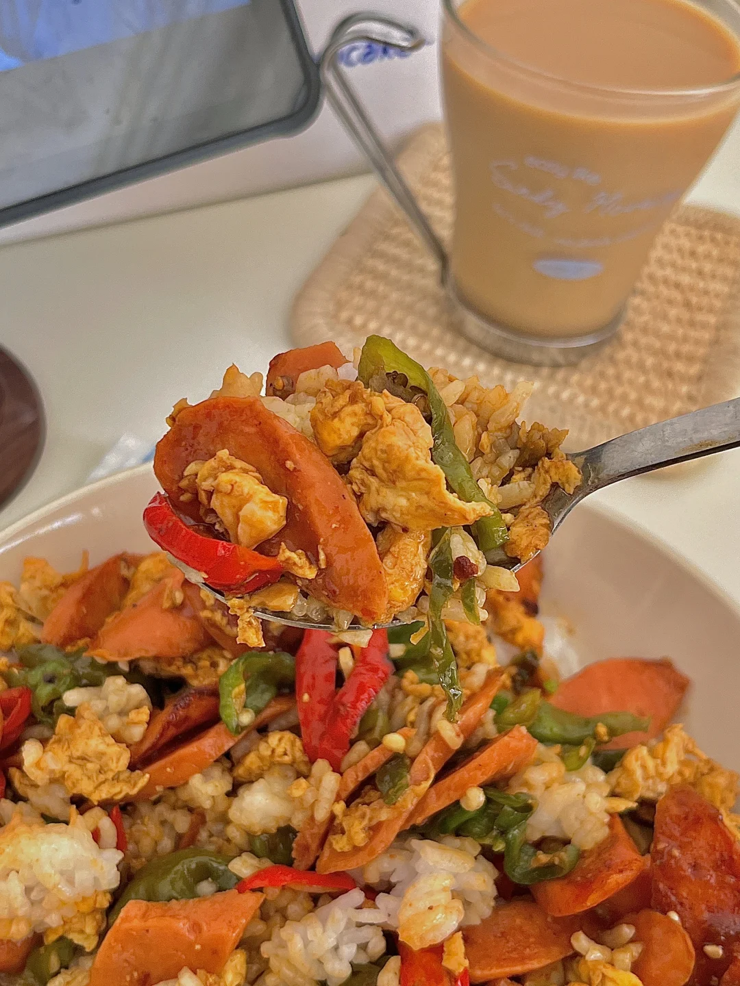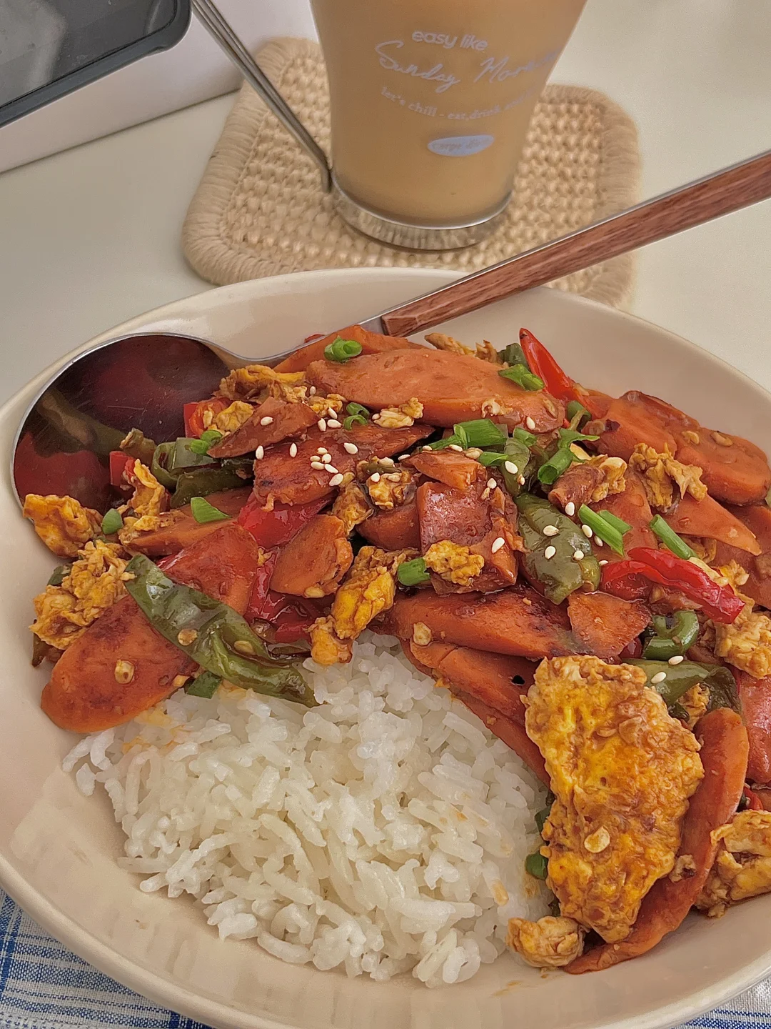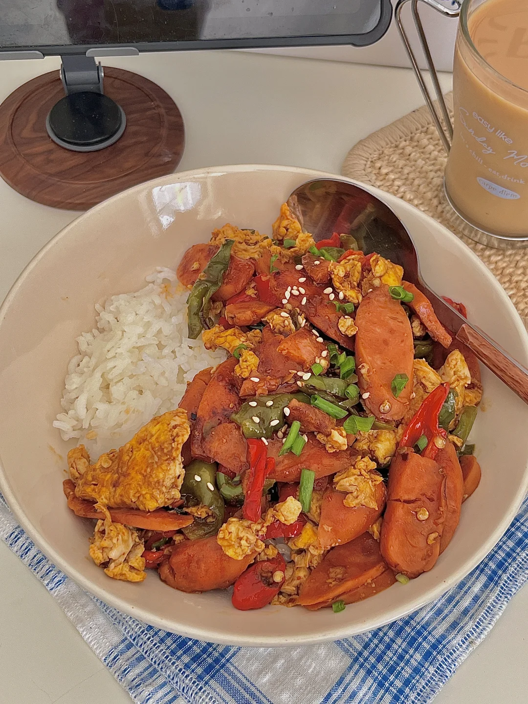 🍴今日份一人食: 香肠炒鸡蛋盖饭 拿铁 . 香肠炒鸡蛋是巨香巨下饭的一道菜😋鸡蛋嫩滑入味 火腿肠焦香,汤汁浓郁 裹着香香的大米饭🍚拌一拌巨好吃😋做法简单 爱吃的宝一定要去试试呀✌🏻