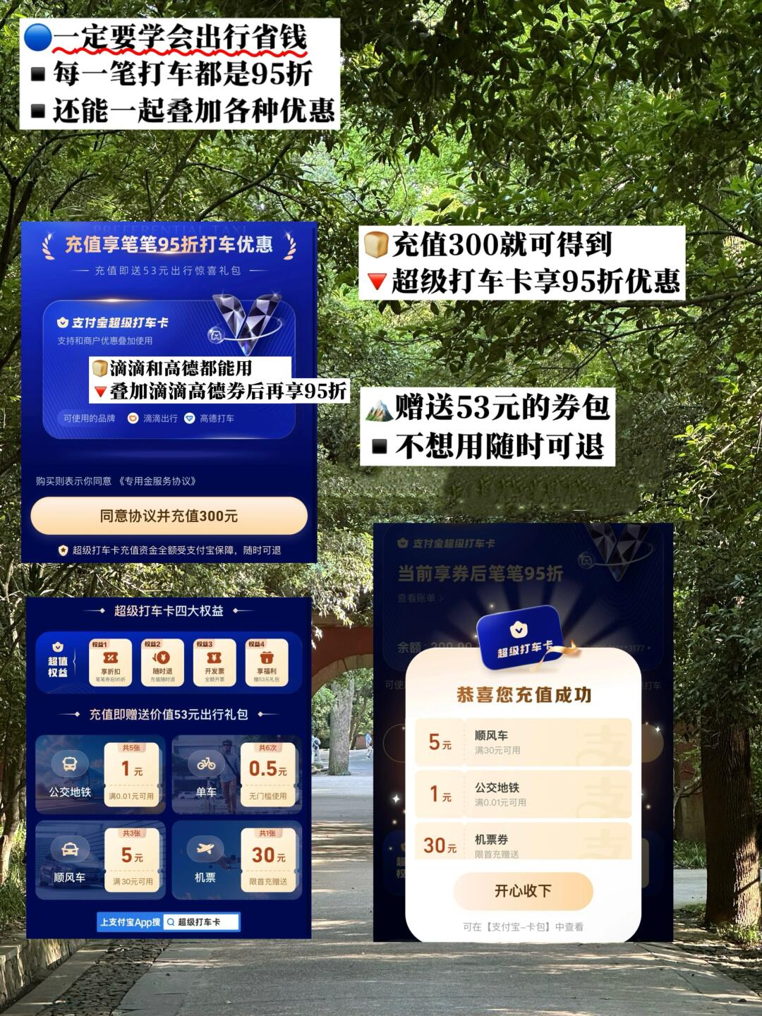 ▪️超级打车卡充300享打车笔笔95折,还可叠加滴滴高德商家券使用。从现在到9月1日,每周五六秒杀10元无门槛打车券。路径①支付宝搜索【夏日打车补贴】,跳转专题页参与;②支付宝首页点出行,选打车频道,点高温打车补贴