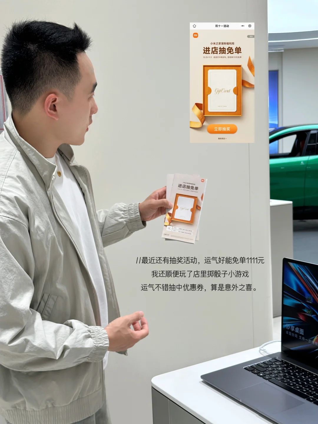 ▪️现在我不再跟风买华而不实网红款,家里电器基本都是小米,我的原则是品质稳定操作简单。这次帮爸妈换家电,我对比了好几家线下门店最后还是选择去了小米之家看样机,最近还有抽奖活动,运气好能免单1111元。我还顺便玩了店里掷骰子小游戏,运气不错抽中优惠券,算是意外之喜。
