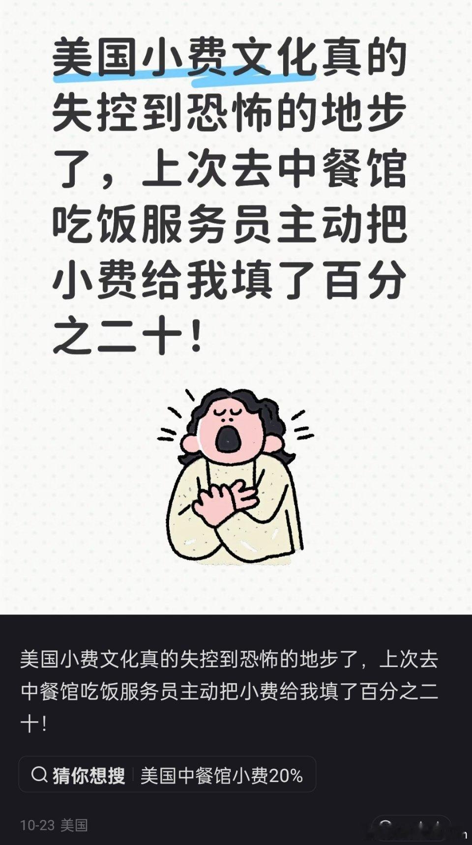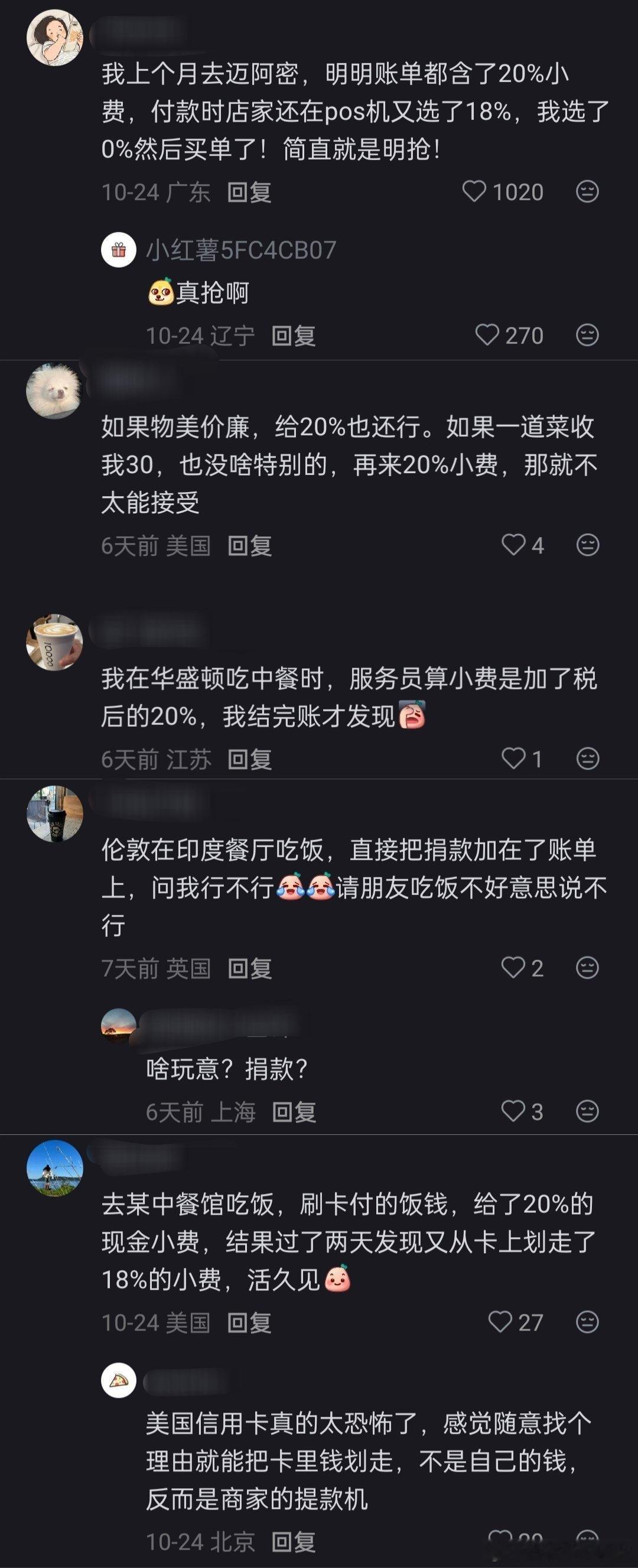 美国小费文化已经失控到恐怖的地步了,有网友去中餐馆吃饭,服务员主动把小费填了20%,甚至有的服务员小费是算税后的,被重复收取小费的套路也很常见。[流汗][流汗]热点现场