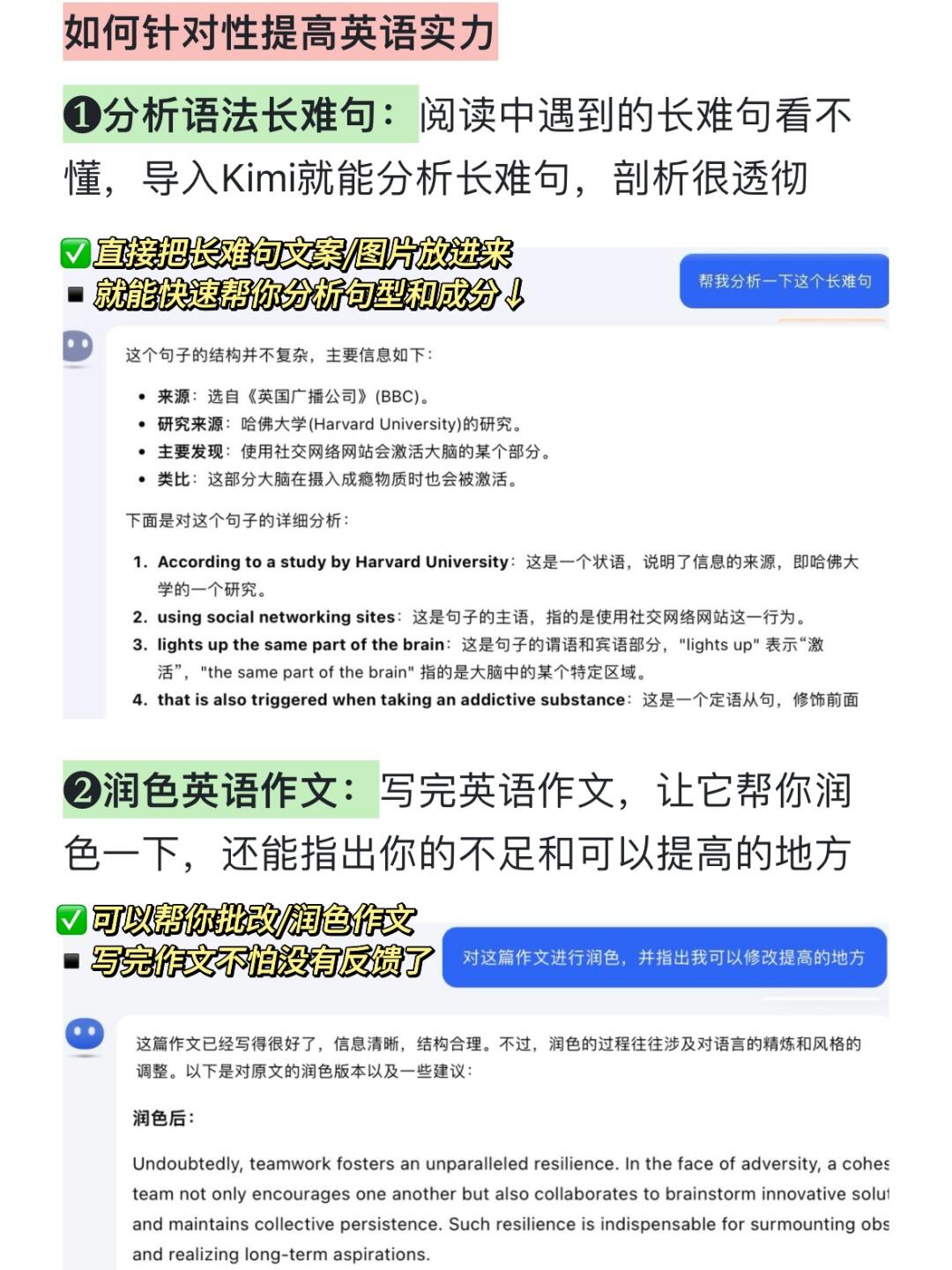 ▪️阅读中遇到长难句,我方法是粘贴到Kimi智能助手,快速剖析语法和成分。作文写完直接丢进去,让AI润色或提出需改进地方,有反馈+修改实现闭环提升