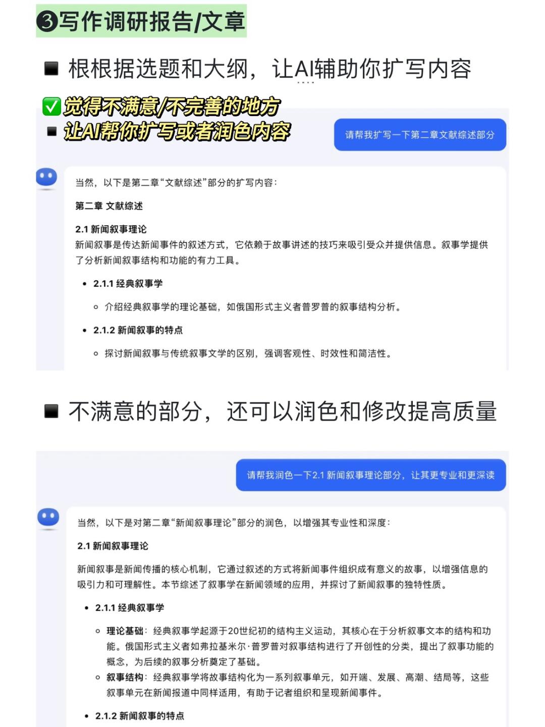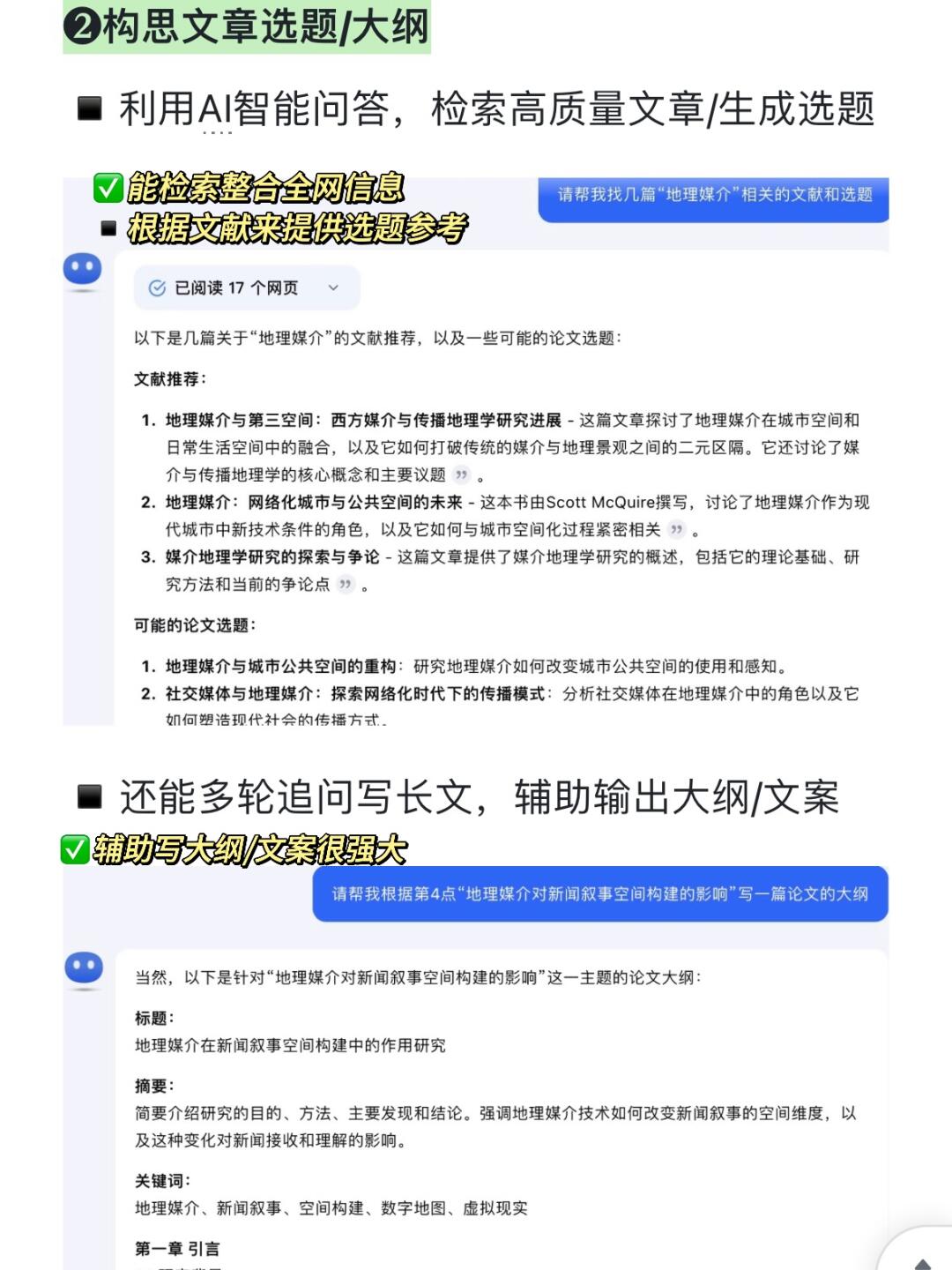 ②写作文章:利用AI智能问答,描述需求就可让AI生成选题并丰富大纲,例如“帮我检索地理媒介相关文献并提供选题”,还能让AI完善大纲和文案,不满意的地方让它帮你丰富和润色