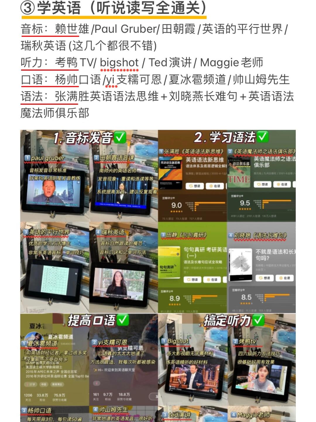 ✔️口语:杨帅口语+yi支糯可恩+玛丽莲馒头,每天跟读模仿三句话