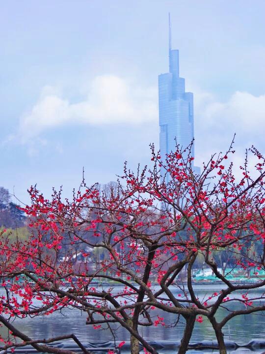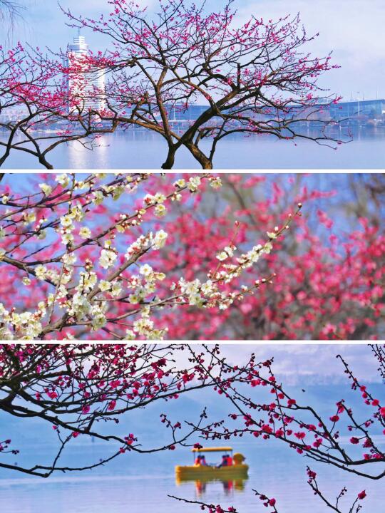 玄武湖公园的梅花主要集中在梁洲,沿湖边都有种植梅树,以湖水和梅花做背景,拍照非常有意境,孤独的网红梅花树,就在梁洲的湖边