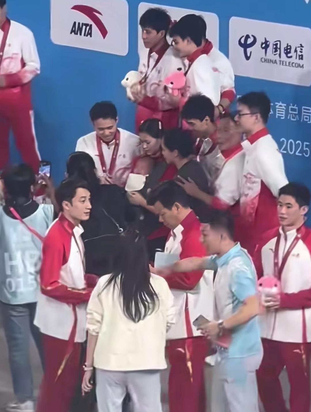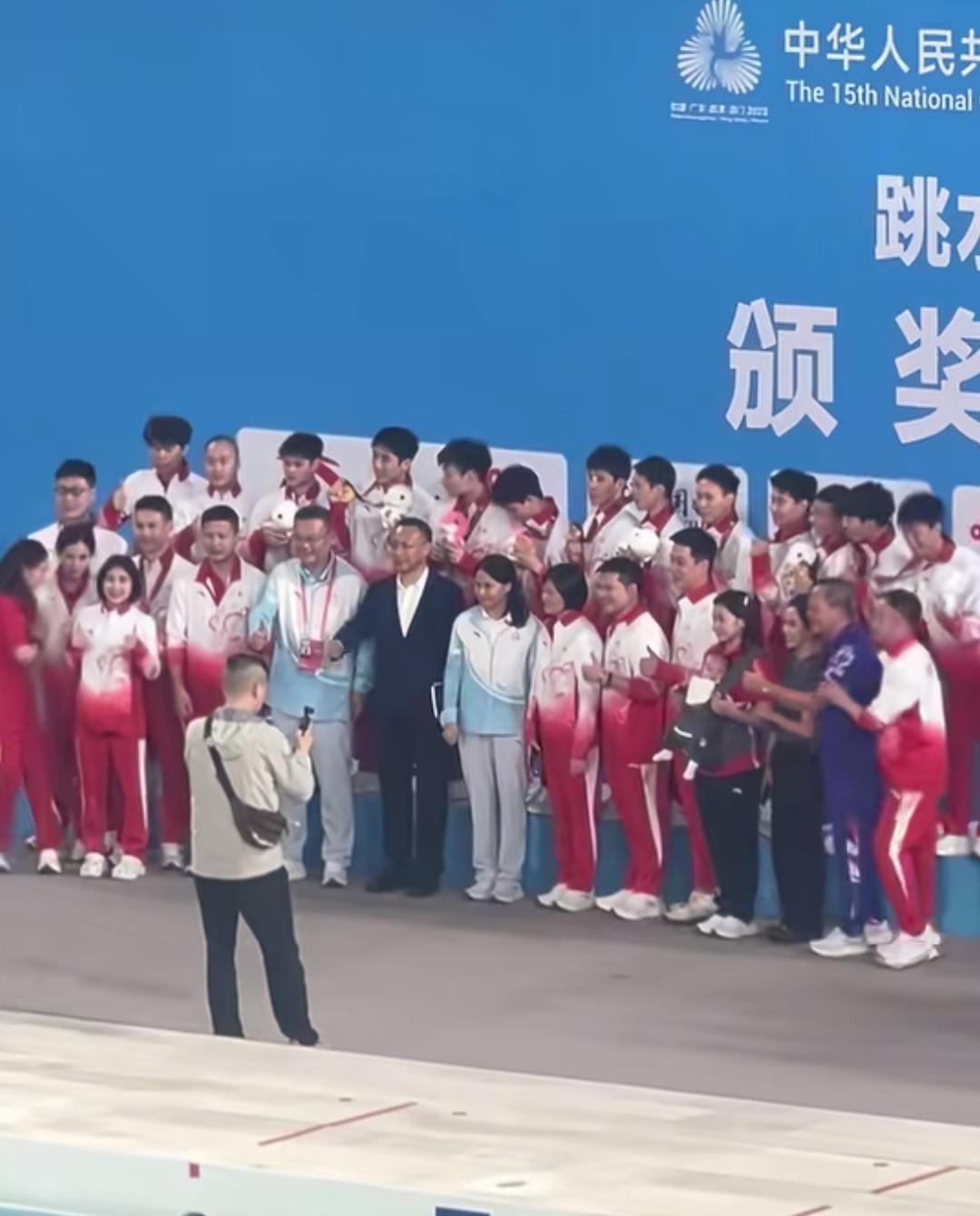 11月3日,全红婵抱着师兄谢思埸的宝宝站在领奖台上与大家合影,开心的不得了,这半年来全红婵积极备战运动会,直到比赛结束才松口气,可以放松抱娃了。 巴黎奥运会后,全红婵有时间回家了,两次过节回家就在村里抱着父亲朋友的女儿玩,从那时粉丝们知道全红婵喜欢抱孩子玩。 这次广东队夺得男女团体跳水冠军后,运动员们集体合影时,全红婵比较特别,双肩上挎着背带,背带里是谢思埸的宝宝,她就一边抱着宝宝一边合影,享受这份合影的喜悦。