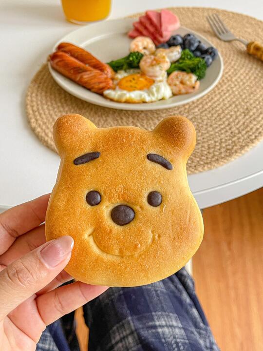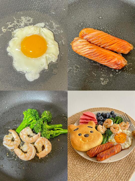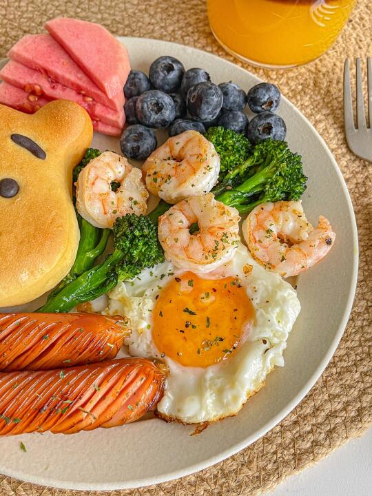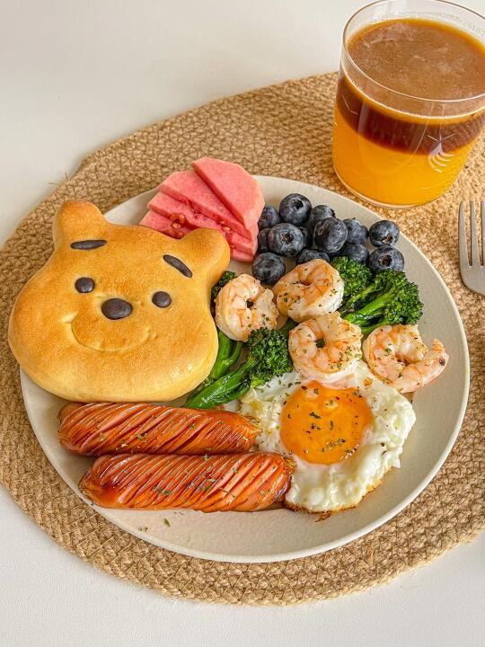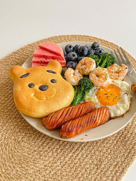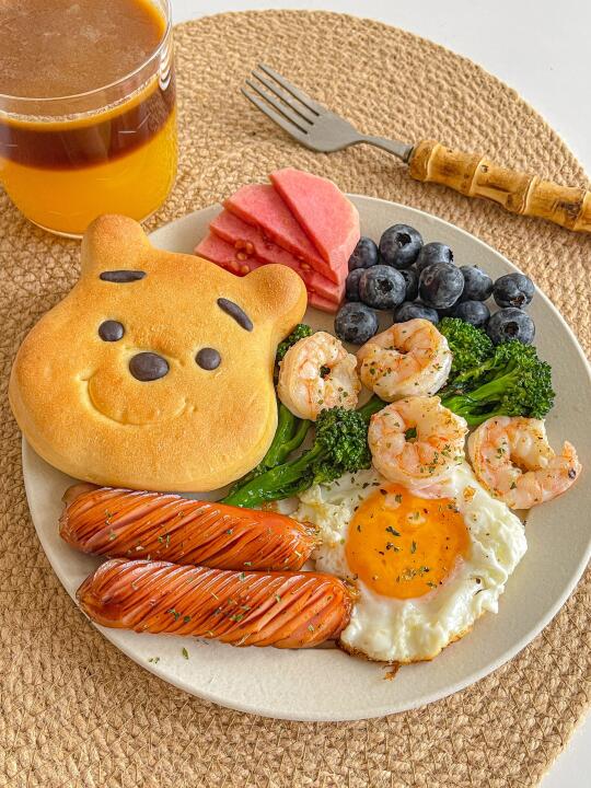 简单好吃的一盘端[派对R] 今日菜单:🍳 🐻维尼熊面包 🦐虾仁 🍳煎鸡蛋 🌭烤肠 🥦西蓝花 🫐蓝莓 芭乐 🍊橙汁美式 朋友送了好多可爱面包!又可以每天不重样了![偷笑R]