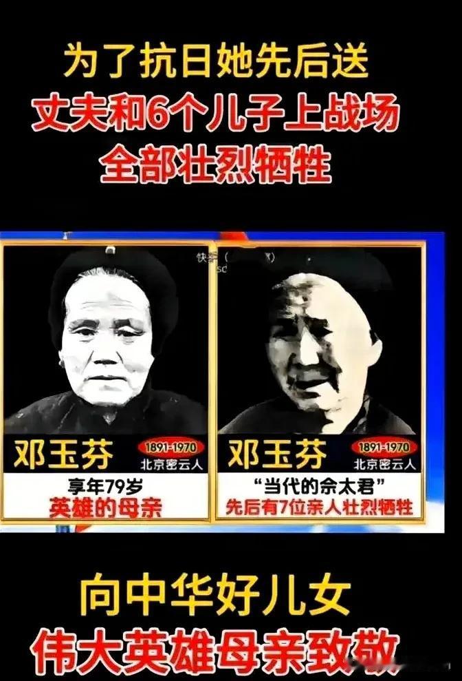 1949年,58岁的邓玉芬喜极而泣,她原本以为七个儿子都已死,没想到老三永兴竟奇迹般地活着回来了! 谁能想到,这位河北密云的普通农妇,前几年还在坟茔间哭断肝肠。1938年冀热察挺进军扎根平北,她咬着牙把老大、老二送进队伍,转头又拍着老三永兴的肩膀说“国难当头,咱不能躲”。 那会儿邓玉芬正蹲在灶台前烧火,锅里煮着稀得能照见人影的玉米粥。院门外传来“娘”的一声喊,声音沙哑得像被砂纸磨过,她手里的烧火棍“哐当”掉在地上,扑过去就攥住永兴的胳膊——这孩子穿着洗得发白的灰布军装,左胳膊空荡荡的,袖子挽到肘弯,露出一道长长的疤,脸上还有没褪干净的晒斑,可那双眼睛,跟他爹年轻时一模一样。 “你咋才回来?你哥他们……”话没问完,眼泪就砸在永兴的衣襟上,洇出一个个小湿圈。 永兴把仅有的右手抬起来,轻轻拍着娘的后背,声音发颤:“娘,我在张家口打仗时被鬼子的炮弹炸伤了胳膊,在后方医院躺了半年,后来部队转移,我跟丢了,一路打听着往家走,走了半个月才到这儿。” 他说着,从怀里摸出个布包,里面是块磨得发亮的铜怀表,“这是二哥给我的,他说等胜利了,让我拿着它回家找您。” 邓玉芬接过怀表,指腹在表壳上摩挲着——这表还是1938年老大老二参军时,她把家里唯一的老母鸡卖了,换钱给俩孩子买的,老大一块,老二一块。 1941年冬天,八路军的通讯员冒着雪来家里,带来老大牺牲的消息,说他在反“扫荡”时为了掩护战友,被鬼子的机枪扫中,连尸体都没找着。 那会儿她正坐在炕头纺线,线轴“咕噜噜”滚到地上,她没去捡,只是盯着墙上老大临走时贴的“保家卫国”四个字,盯了整整一夜,第二天照样起来给八路军送军粮。 没过半年,老二的消息也来了。通讯员说老二在攻打炮楼时,抱着炸药包冲在最前面,炮楼塌了,他也没出来。邓玉芬那天没哭,只是把给老二做的新布鞋收进木箱,锁上,钥匙扔在灶膛里。 村里有人劝她“别再让孩子去打仗了,家里就剩你一个人了”,她却摇头:“鬼子不赶走,咱老百姓哪有安稳日子过?就算我只剩一个儿子,也得让他去!” 后来1940年,她又把老三永兴送进了队伍,转头又拍着老四的肩膀说“你哥仨都去了,你也得跟上”。 老四、老五、老六、老七,一个个都揣着她烙的贴饼子走了,最小的老七那年才16岁,走的时候还拽着她的衣角哭,她硬着心肠把孩子的手掰开:“哭啥?等打跑了鬼子,娘给你做糖糕吃。” 可日子没等来回孩子,却等来一个又一个坏消息。1944年,老四在战斗中牺牲;1945年,老五、老六在掩护群众转移时被鬼子包围,最后拉响手榴弹跟敌人同归于尽;老七跟着部队转战到东北,从此没了音讯。 村里人都说“邓家的娃全没了”,她就揣着几个干硬的贴饼子,沿着八路军打仗的地方找,见着坟茔就磕头,嘴里念叨着“娃啊,娘来看你了”,哭到嗓子哑得说不出话,也没找着一个孩子的尸骨。 现在永兴回来了,邓玉芬拉着他的手,往屋里拽,灶台上的玉米粥早就凉了,她又重新添柴,把家里仅有的几个鸡蛋打进锅里,还烙了张白面饼——这面是前几天村干部送来的救济粮,她一直没舍得吃。 永兴看着娘忙碌的背影,后背的衣服破了个洞,露出里面打补丁的旧棉袄,心里发酸:“娘,我回来就好了,以后我陪着您。” 邓玉芬没回头,只是擦了擦眼睛:“陪啥?你身子好点了,还得去看看你那些战友。你哥他们没白死,现在鬼子打跑了,咱国家要太平了。” 后来永兴伤好后,真的去了当地的武装部,帮着整理牺牲战士的名单,邓玉芬也没闲着,每天帮着村里的妇女做军鞋,纳鞋底的线勒得手指生疼,她也没停——她总说,多做一双鞋,前线的娃就能少受点罪,就像她的儿子们一样。 邓玉芬不是啥大人物,就是个普通的农村妇女,可她把七个儿子的命都系在了国家上。 喜极而泣的背后,是数不清的不眠夜,是坟茔前的声声呼唤,是“国难当头,咱不能躲”的朴素信念。这种把小家放在大家后面的牺牲,不是口号,是一个个贴饼子、一双双布鞋、一次次目送儿子远去的背影堆起来的。 各位读者你们怎么看?欢迎在评论区讨论。