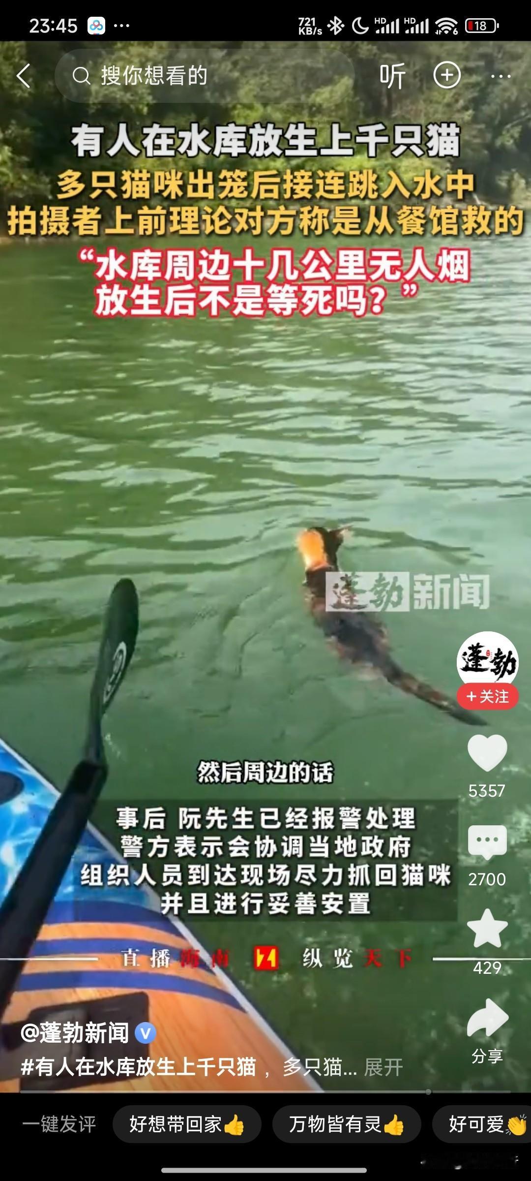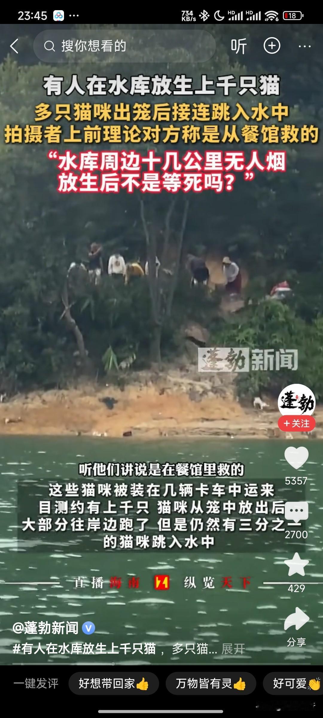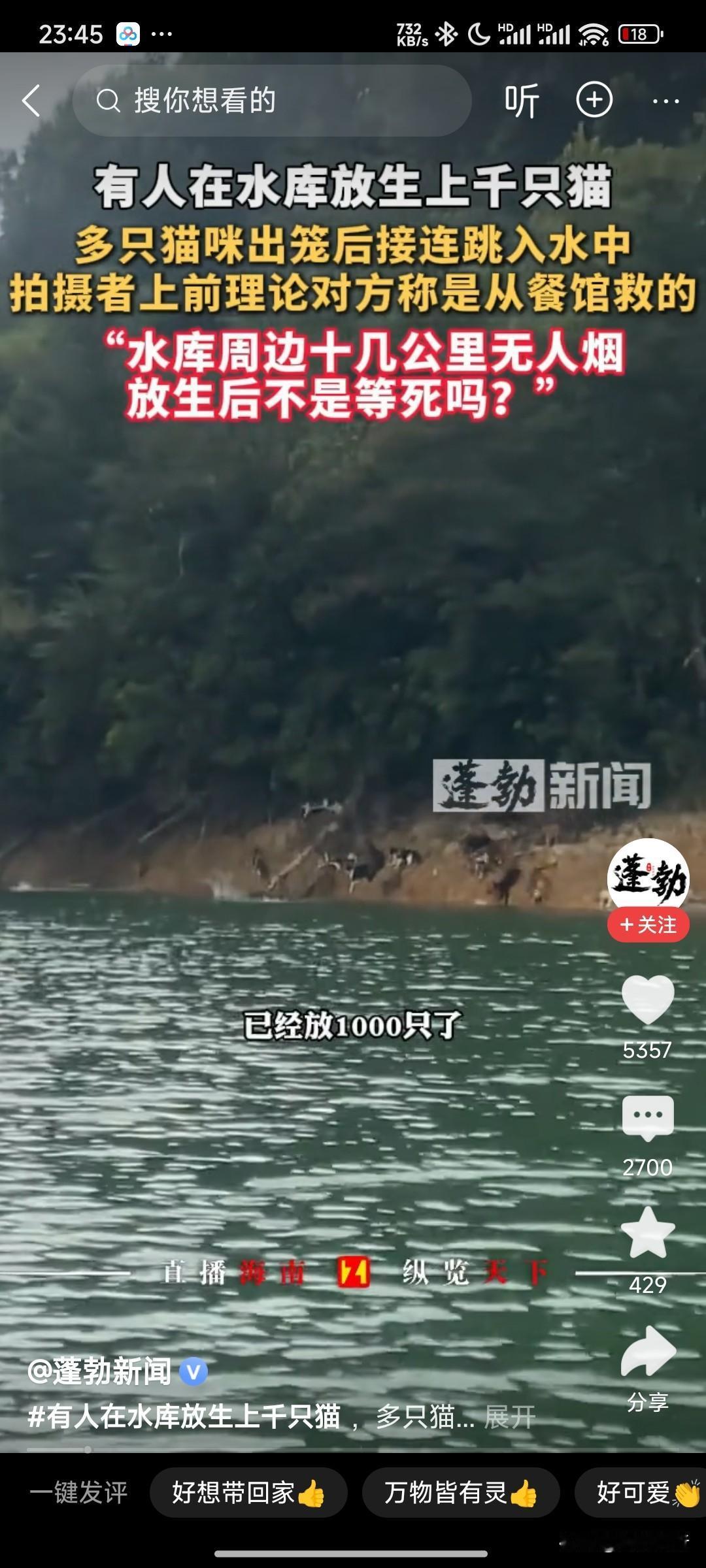 1000只猫被扔进水库放生,这哪是行善分明是造孽! 广东水库边惊掉下巴的一幕,有人竟放生1000多只猫,猫咪受惊直接跳进水,山上遍地都是乱窜的猫咪,已经有不少没挺过来。 放生的女生说自己是救猫没地方养,还放了猫粮,可猫哪懂在野外求生,不是跳河溺亡就是饿肚子,尸体还污染水源,活着的也会破坏当地生态。 好心没做错,但善良得带脑子。放生不是甩锅,盲目行善比作恶更伤人。 我觉得救助动物得找对方式,认养、联系救助站都比乱放生强。