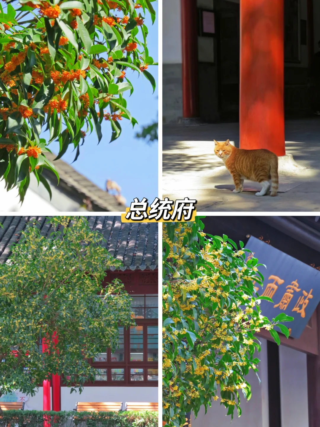 总统府的桂花分布比较散,整个景区都有,坐在桂花树下的长椅上闻着桂花香,撸一撸府猫,真的很治愈