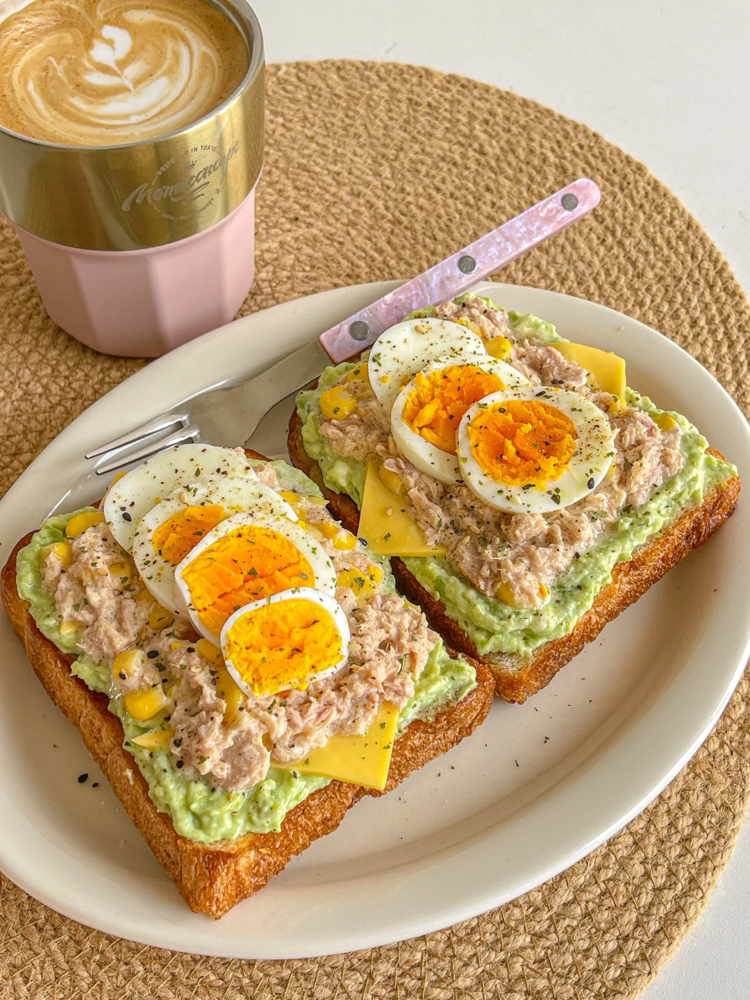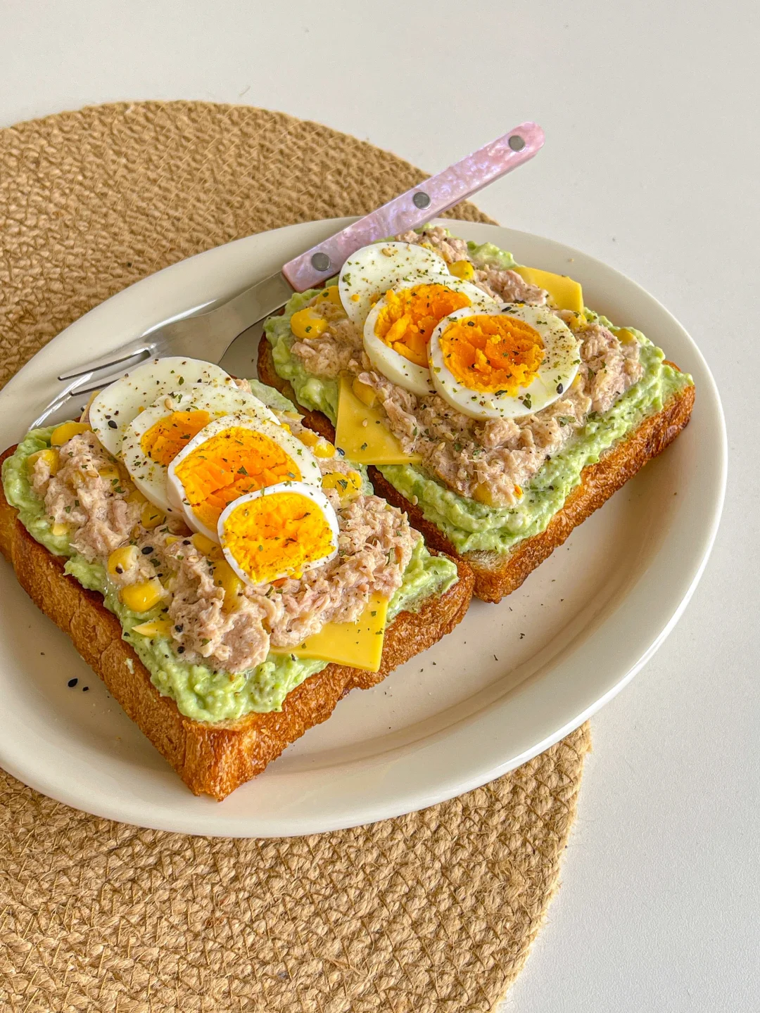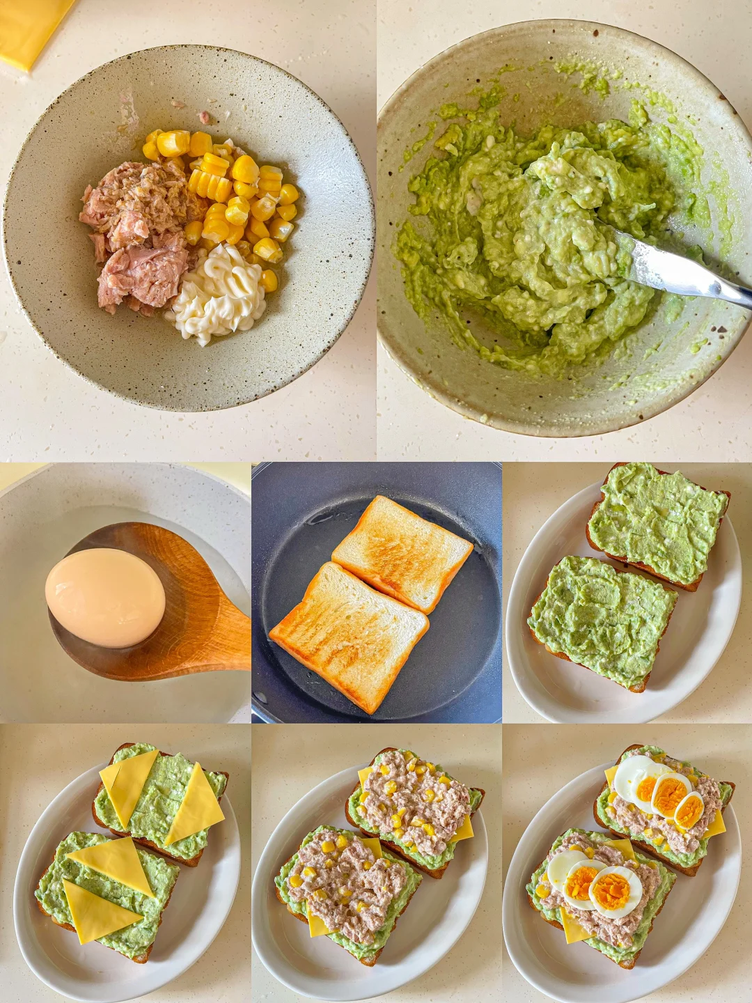 吐司➕牛油果➕奶酪➕芝士片➕金枪鱼➕玉米➕低卡蛋黄酱➕黑椒海盐➕鸡蛋