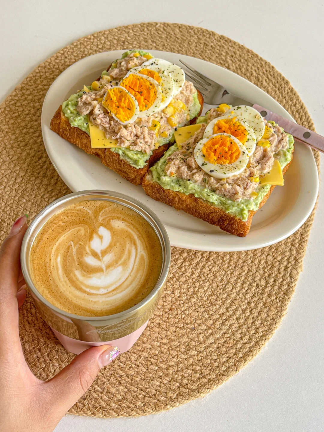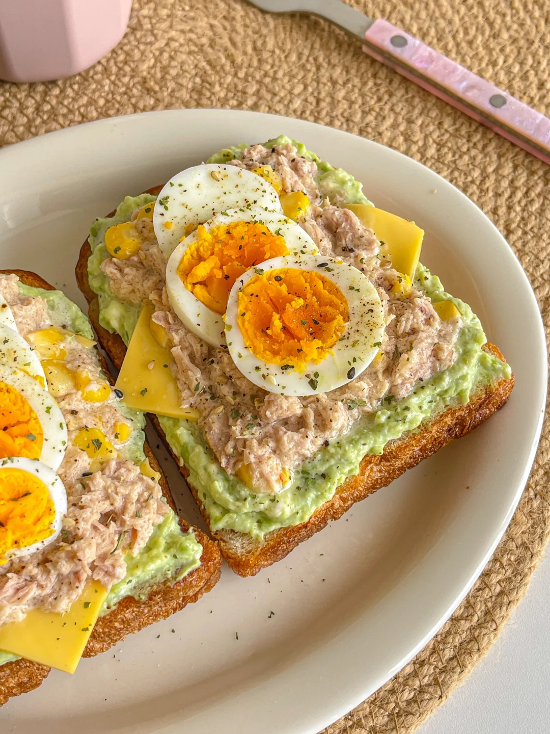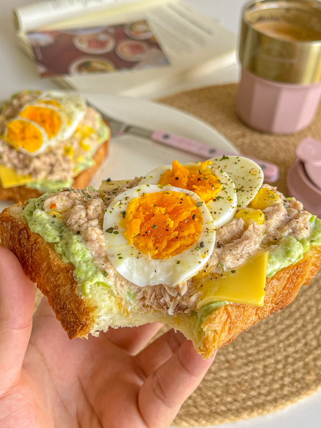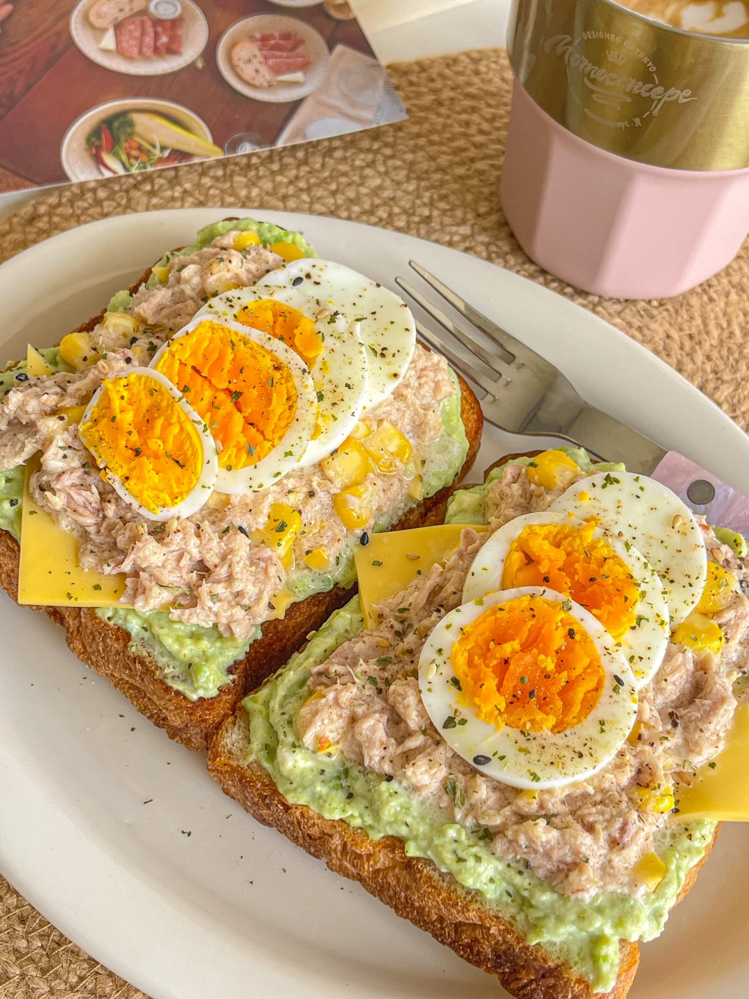 吐司➕牛油果➕奶酪➕芝士片➕金枪鱼➕玉米➕低卡蛋黄酱➕黑椒海盐➕鸡蛋