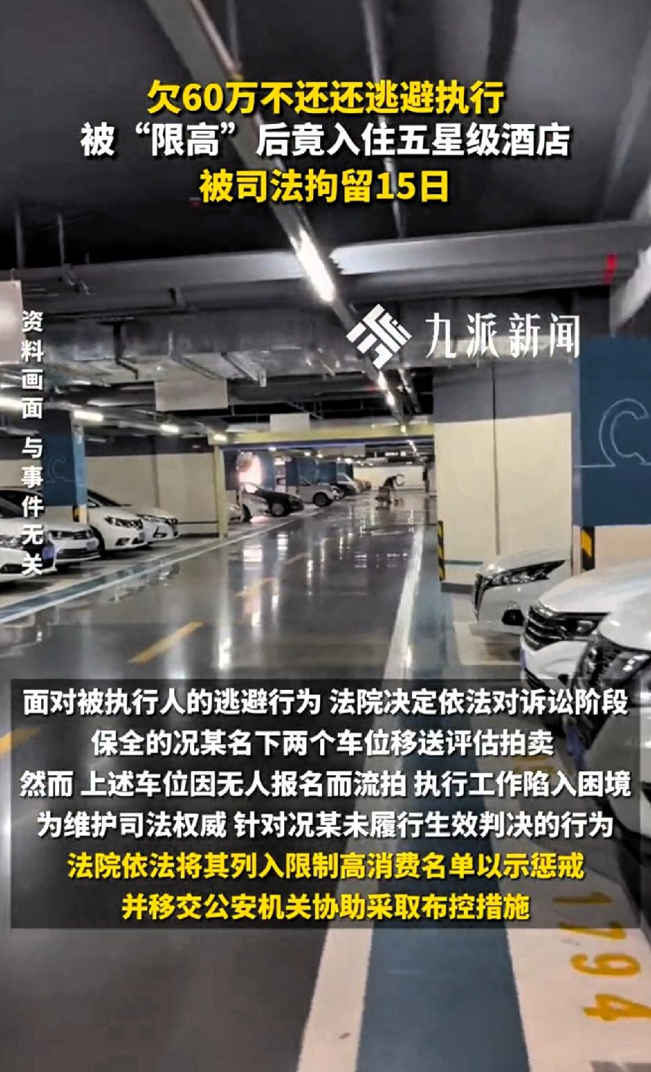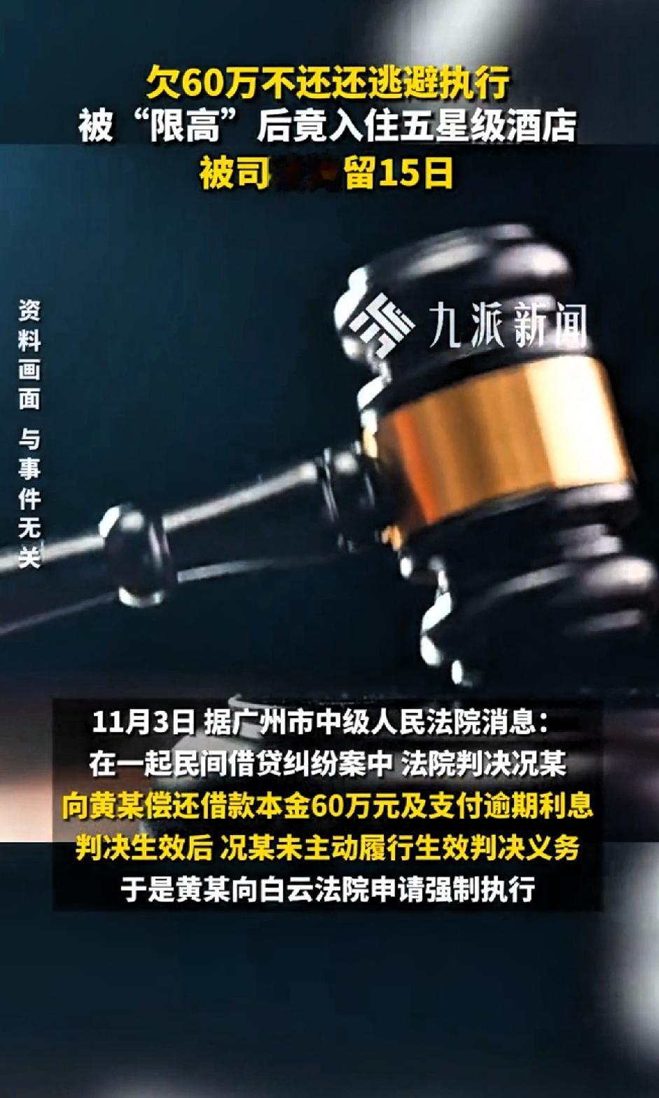 欠60万不还 还逃避执行,被“限高” 后竟入住五星级酒店,被司法拘留15日。 现在老赖真是越来越嚣张了!就说李某,欠着445万本金和相应利息呢,跟人家达成和解协议后压根不履行。 银行这会干嘛去了?不能强制还款吗? 法院恢复执行立案,他对传唤不理不睬,也不报告财产,执行干警找他不下10次都没结果,电话也不接,妥妥的逃避执行。 这种人天不怕地不怕,一副我是老赖我怕谁!碰到这种人也是倒霉! 更离谱的是,被“限高”了还高调入住五星级酒店参加活动。好在法院干警没放弃,掌握线索后就把他控制了。 最终,李某因严重违反限制高消费令被司法拘留15日。这种老赖就该严惩,不然真不把法律放眼里! 要我说拘留15日太少了,放出来后还不还钱,再继续拘留。 对待这种老赖就要严惩。