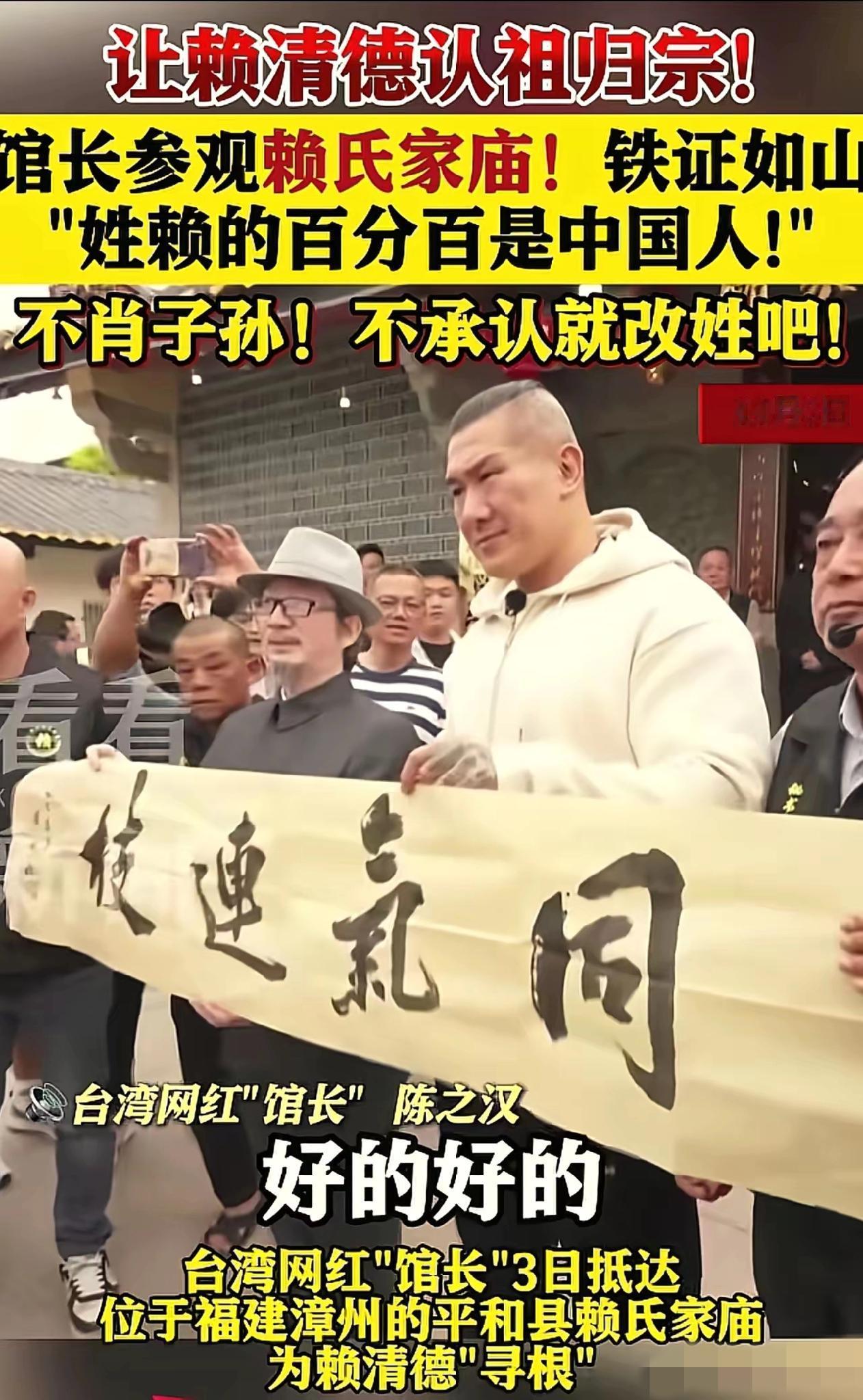 赖清德刚说自己不是中国人,馆长陈之汉就帮他去福建寻根,要让赖清德认祖归宗!11月3日,馆长参观赖氏家庙,得到一个“铁证”:姓赖的百分之百是中国人!这就仿佛一记响亮的耳光,扇在那叫嚎自己不是中国人的老赖脸上。网友们经常打比方来形容那些看不清大势的人:饭菜端上桌了,一杯凉水先灌饱了;1944年底跑去日本广岛定居;富士山头冒浓烟了他还要去看樱花;1912年2月11日央人净身准备去皇宫当太监……好吧,赖清德不愿意要根,那会是什么了?