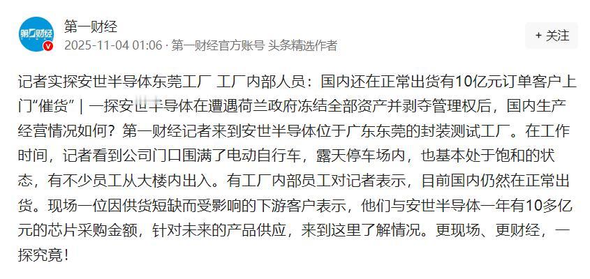 荷兰那边刚掀桌,东莞工厂却爆满,10亿订单客户上门催货,这一回真的很稳 最近,记者跑到安世半导体在广东东莞的封装测试工厂看看安世的现状。 在工作时间,工厂门口密密麻麻停满了员工的电动自行车,露天的停车场一位难求。大楼里员工进进出出,一片繁忙,压根没有半点受到海外风波影响的萧条样子。 厂子里的内部人员直接撂下一句大实话:别瞎猜了,我们国内这边,一切正常,货照出不误! 更让人意想不到的是,现场还碰到了一位特意找上门的下游客户。人家一开口,分量就够重:他们公司一年跟安世半导体的采购额,足足有10多个亿!这次来,就是因为担心后续供应出问题,亲自跑来了解情况,说白了,就是“上门催货”的。 你看,海外一纸禁令,等来的不是我们的手忙脚乱,而是我们的胸有成竹、照常运转。 为啥海外资产都被冻结了,国内工厂还能稳坐钓鱼台? 这里头,门道可就深了。说白了,这就叫“东方不亮西方亮”。而且,这事儿恰恰暴露了一个很多人不知道的关键点:被荷兰政府扣下的那些晶圆厂,压根就不是什么核心先进产能,说的直白点,都是他们那边最落后的生产线。 真正最先进、最核心的生产能力和技术,早就被我们布局在国内了。 人家想用几座老旧的海外工厂来卡我们脖子的算盘,这回怕是打不响了。 所以,荷兰那边闹得再凶,也只能影响到他们本土那点落后产能的运营,对我们国内根深叶茂、技术先进的主生产基地,根本伤不到筋骨。东莞工厂的机器照转,货照发,客户的钱照付,这就是最硬的底气。 实话实说,经过这几年在半导体领域的卧薪尝胆,我们的产业链韧性早就今非昔比。某些国家以为还能像过去一样,随便一纸禁令就能让我们某个产业停摆,这种老黄历,该翻篇了。 安世半导体东莞工厂的繁忙景象,和客户捧着10亿订单上门催货的急切,就是最好的证明。国际博弈,有时候拼的不是谁的声音大,而是谁家里的根基稳、底牌硬。 接下来,就看谁先坐不住。
