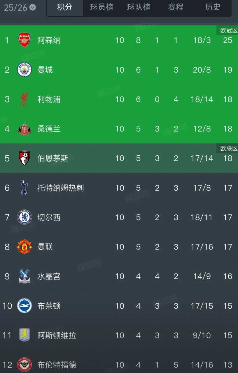 随着桑德兰1-1逼平埃弗顿,英超第10轮的比赛全部结束,最新积分榜也出炉!三支夺冠热门阿森纳、曼城、利物浦分列前三位,两支本赛季的黑马球队桑德兰和伯恩茅斯则排名第四、第五!