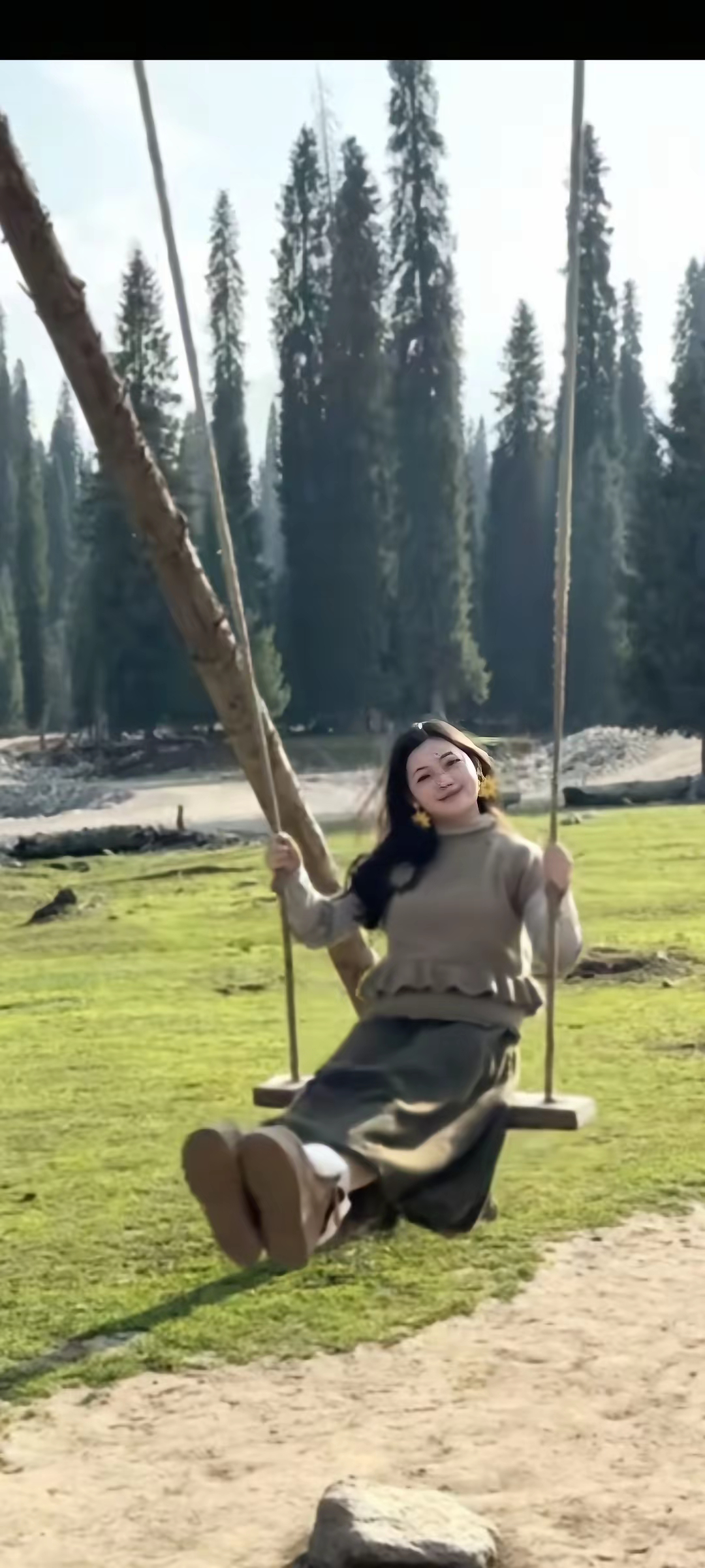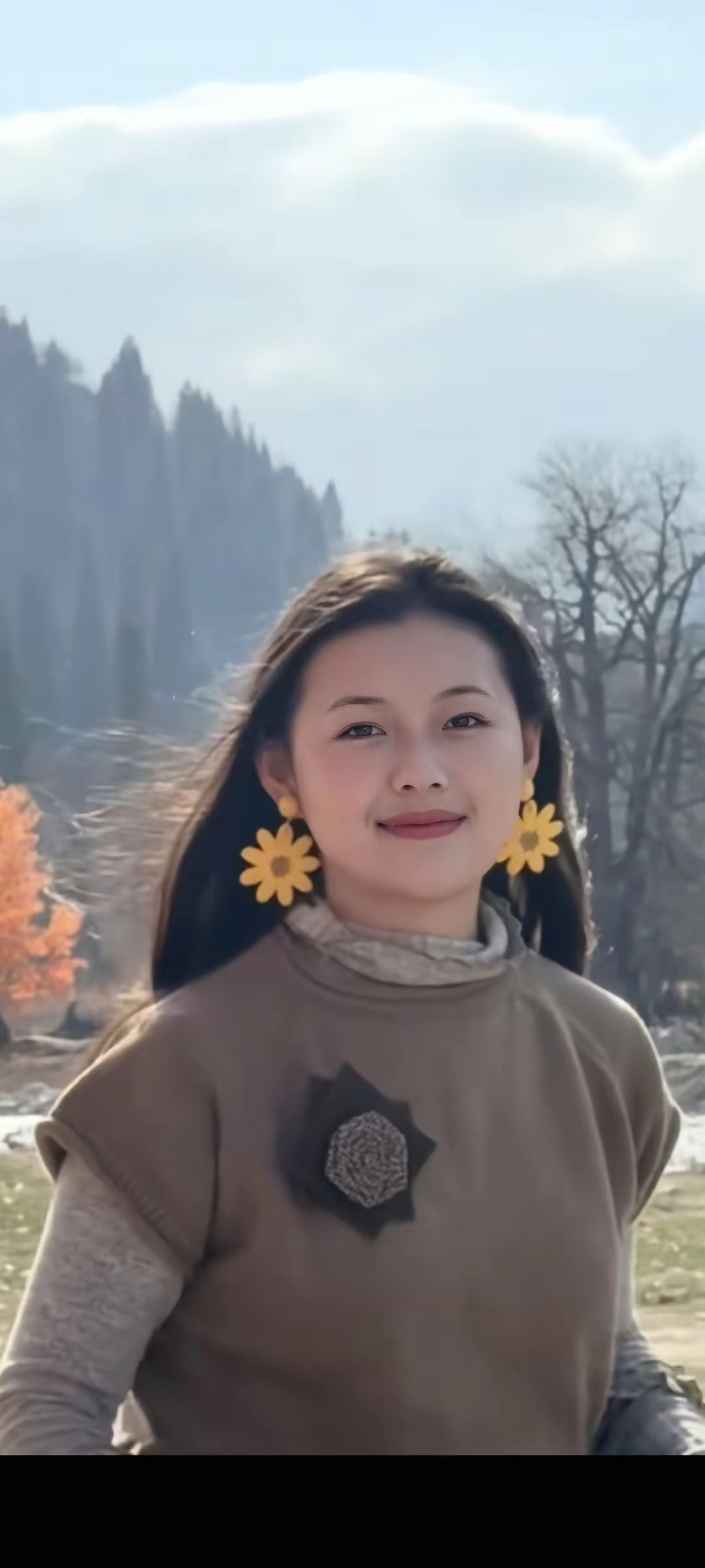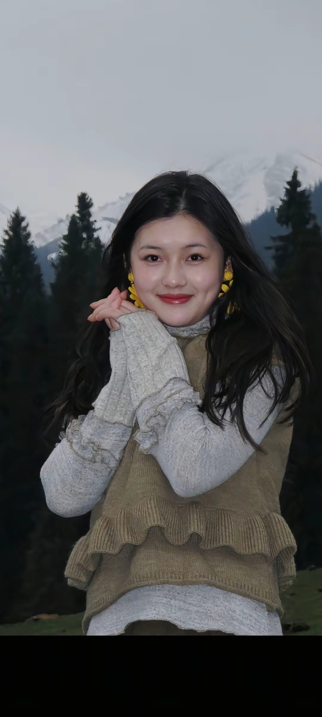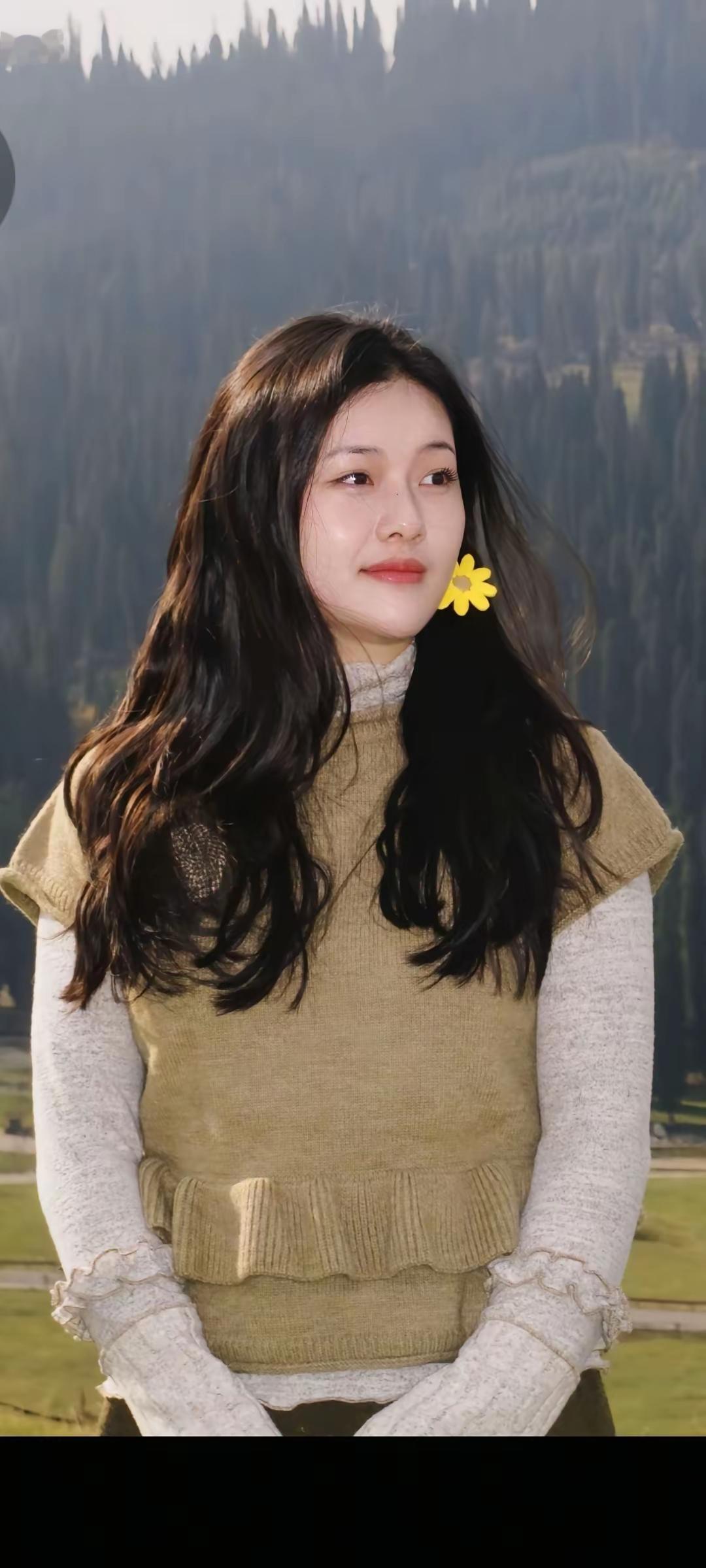 ​小悠来新疆伊犁游玩,她披散长发,身穿毛裙,打卡伊犁的美景。