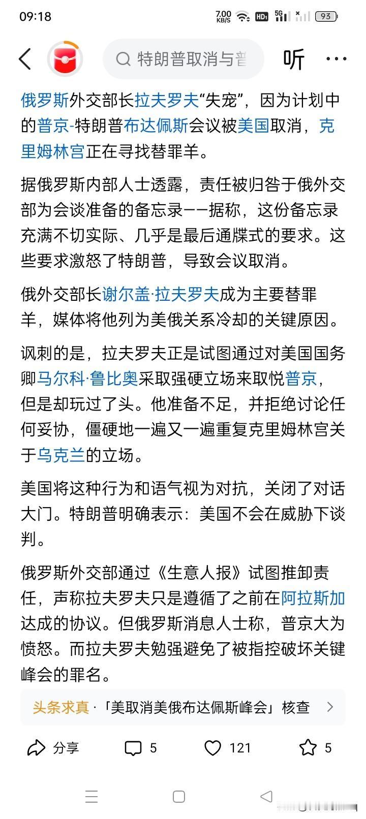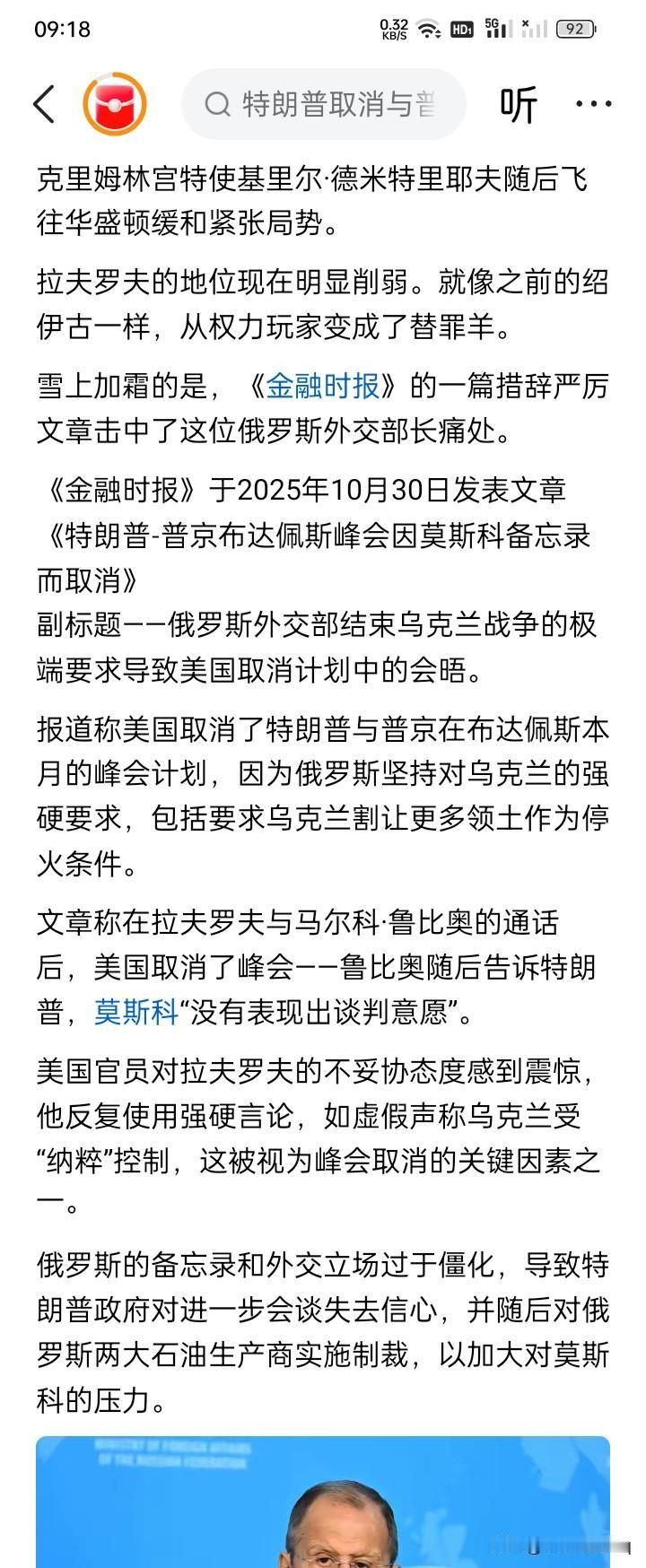 也该歇歇了! 美国总统特朗普取消原定与俄罗斯总统普京在匈牙利的会面,网络上的消息说,是由于俄外交部长拉夫罗夫向美国出示的为会面准备的备忘录中的强硬态度,以及拉夫罗夫在与美国国务卿卢比奥的电话中,仍然是坚持无比强硬的立场。并且因此若怒了特朗普,认为俄罗斯没有解决和结束乌克兰战争的诚意,导致特朗普认为与普京的会晤好像没有任何意义,所以取消了在匈牙利的会晤。因此这个锅应该由拉夫罗夫来背,并且在普京面前从而“失宠”。 现年已经75岁的拉夫罗夫,似乎在乌克兰战争的这个烂滩子已经摸爬滚打了太长的时间,好像早已经有传闻,他希望卸任外交部长,歇一歇。 如果由于特朗普取消与普京在匈牙利的会晤,拉夫罗夫因此失去外交部长或被疏远,估计也不一定是拉夫罗夫的损失,很有可能是他求之不得的事情。实际上,从目前的国际社会和外交形势,拉夫罗夫就是再努力,大概率也很难做出来足以引人注目的成效。