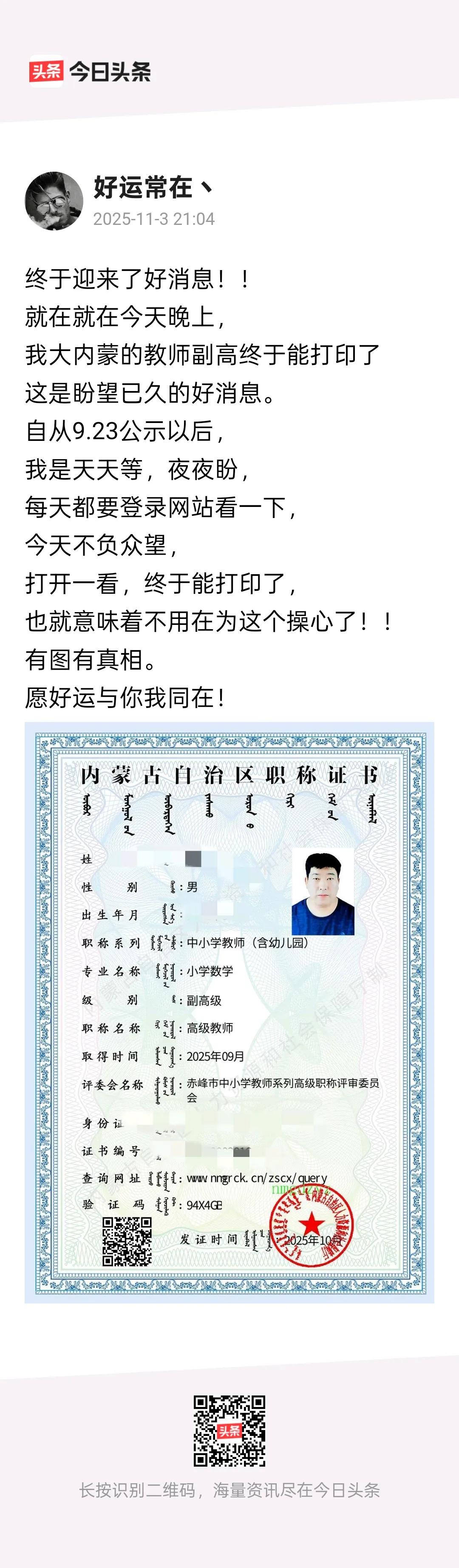 老师的高级职称证书原来长这样! 一个小学老师评上了高级职称,兴奋的把自己的信息都公布出来了! 对一线教学的老师来讲,评上高级的职称真的是很不容易的一件事情。 有的老师教学教了几十年,奋斗了一辈子,还得需要各种天时地利人和,才能在退休之前评上高级 这个内蒙古的小学数学老师就很幸运,直接一步到位评上了高级教师 虽然他也隐瞒了一些信息,但是他发布出来的职称评定证书上面非常清楚地带上了他的个人信息。 评论区也有很多人,很多好事者扫描了那个二维码,直接把他的个人信息全部都扫出来了。 更多的人还是想借他的这个头条,借他的一些好的运气,给自己的职称评定带来一些好运。 其实大家也能看到啊,对于一个老师来讲,所要的真的很有限,能评上一个好的职称,这一生这一辈子就值了。 在他发的头条当中我们也看到,他是日日想夜夜盼,恨不得一天好几次都在网上查询相应的信息。 现在结果终于出来了,尘埃终于落定了,他也兴奋得发了头条,表达自己的喜悦之情,一不留神把自己的信息也公布出来了。 其实也没关系,所有人都在这里祝贺他,所有人也在借他的这个高级职称的证书,希望给自己带来好运