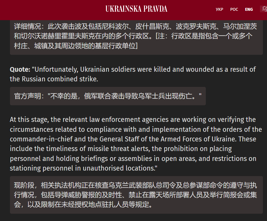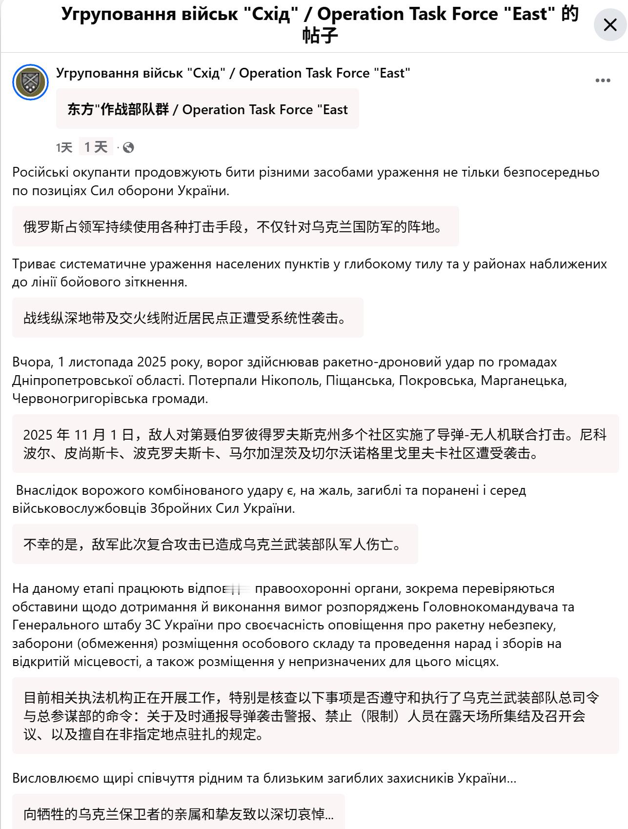 🔻乌克兰媒体报道:乌克兰东部作战指挥部表示,俄罗斯于 11 月 1 日对第聂伯罗彼得罗夫斯克州的乌军实施了弹道导弹与"海鹰-10"无人机的联合打击。