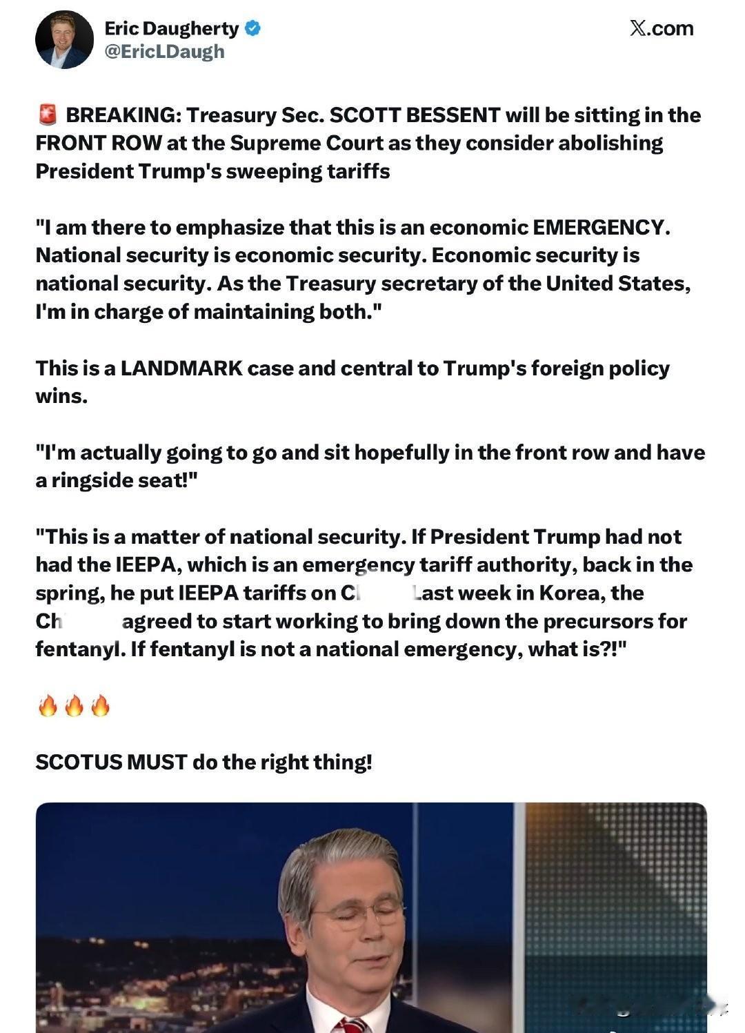 突发消息:财政部长Scott Bessent将坐在最高法院的前排,参与审议是否废除川普总统的大规模关税政策。 “我到场是为了强调这是一场经济紧急事件。国家安全就是经济安全,经济安全就是国家安全。作为美国财政部长,我负责维护这两者。” 这是一个具有里程碑意义的案件,也是特朗普外交政策胜利的核心。 “我实际上打算坐在前排,希望能有一个‘拳台边’的视角!” “这是国家安全的问题。如果川普总统在春天没有动用《国际紧急经济权力法》(IEEPA)这一紧急关税授权,他就无法对CN加征关税。上周在韩国,CN已同意开始着手减少芬太尼前体流入。如果芬太尼问题都不是国家紧急事件,那什么才是?!” 最高法院必须做出正确的选择!