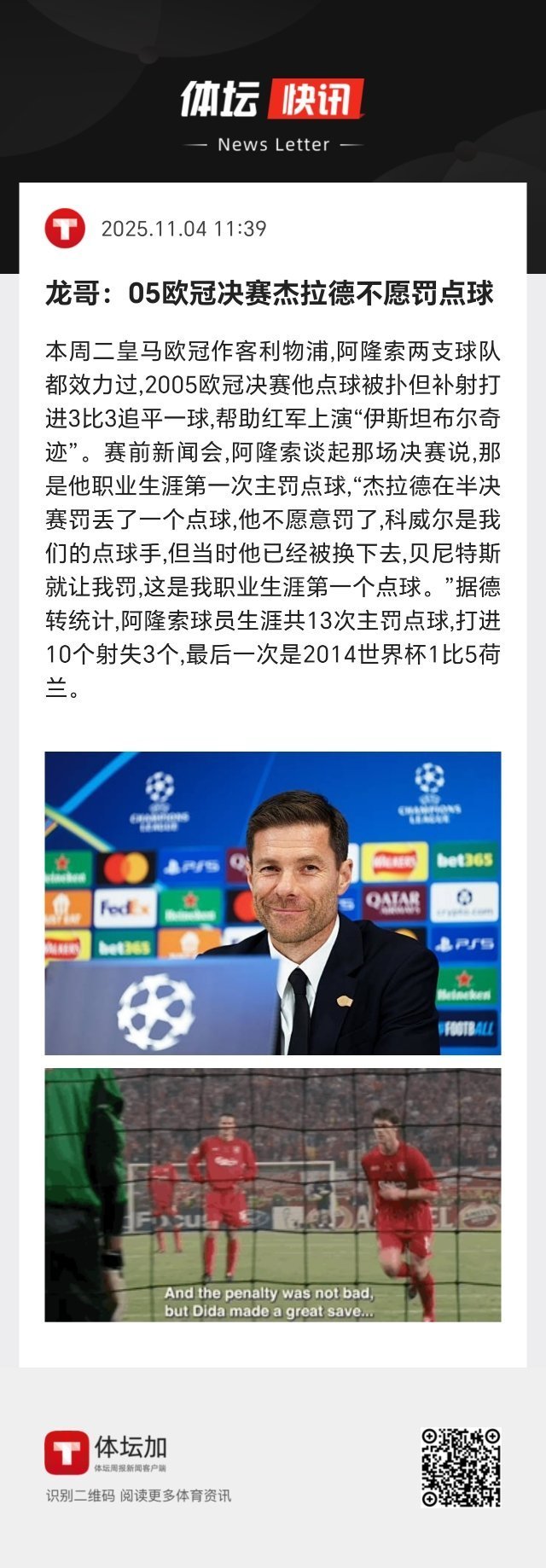 欧冠 阿隆索谈起2005年欧冠决赛时说,那是他职业生涯第一次主罚点球,结果还被扑出来了,幸好补射进了。