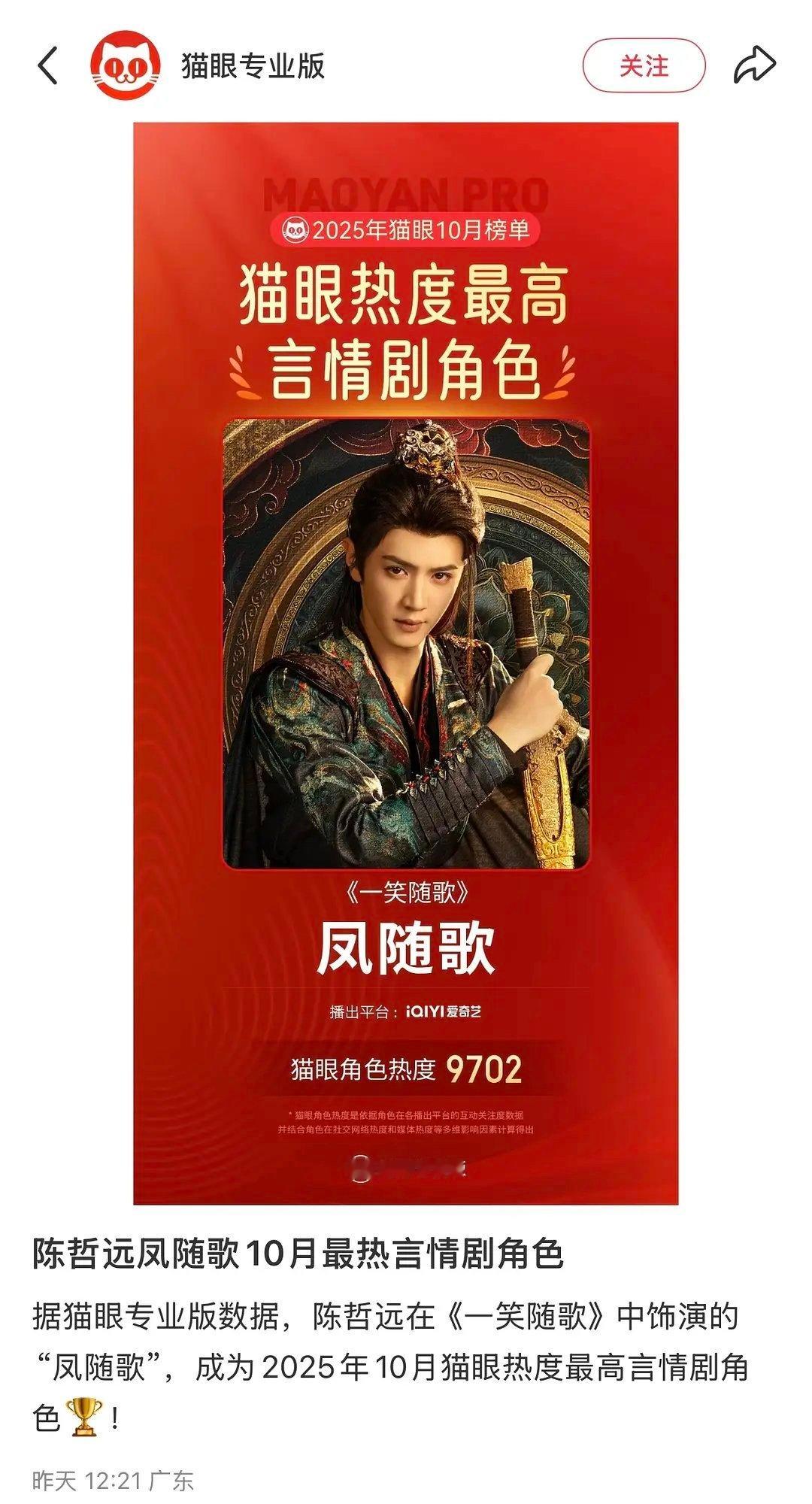 10月言情剧猫眼角色热度第一名出来了