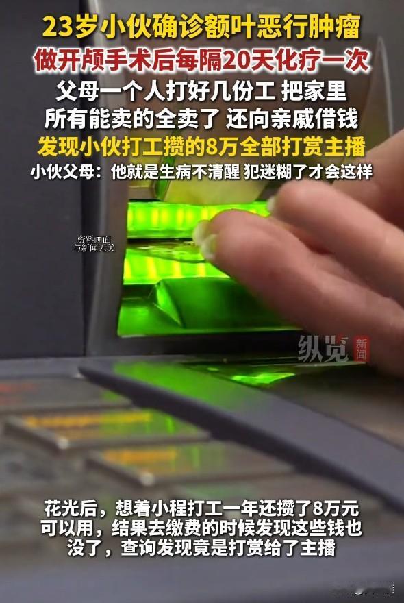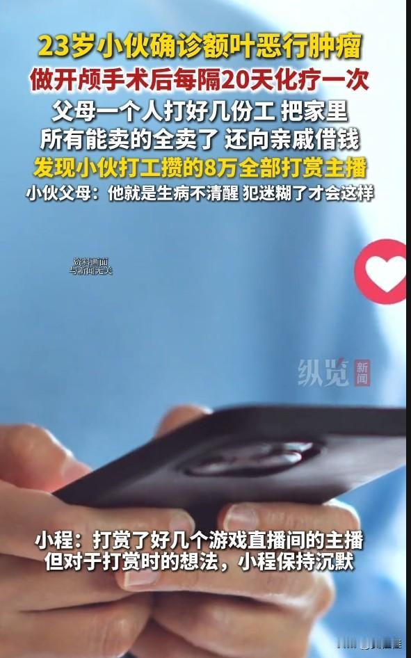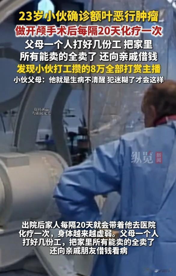 都到这个节骨眼上了,父母还在“惯”这位23岁的“孩子”。 河南商丘的小程得了额叶恶性肿瘤,开颅手术加频繁化疗,把家里拖得底朝天。父母打几份工,卖光家当,跟亲戚借钱凑医药费,结果发现他打工攒的8万全打赏游戏主播了。父母还替他开脱,说他是生病犯迷糊。 这都啥时候了,还这么惯着?自己躺在病床上等救命钱,爹妈在外面为了给他治病累死累活,他倒好,把血汗钱给主播刷礼物图个乐。 都这样了,还不知道心疼父母!给主播打赏那么多,是等着主播来救他吗?