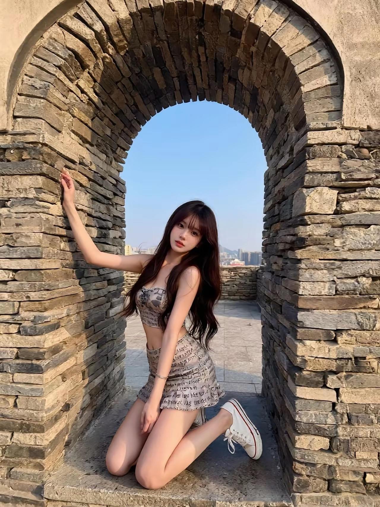 在古老的拱门下,少女轻抚石墙,阳光洒落,岁月静好。