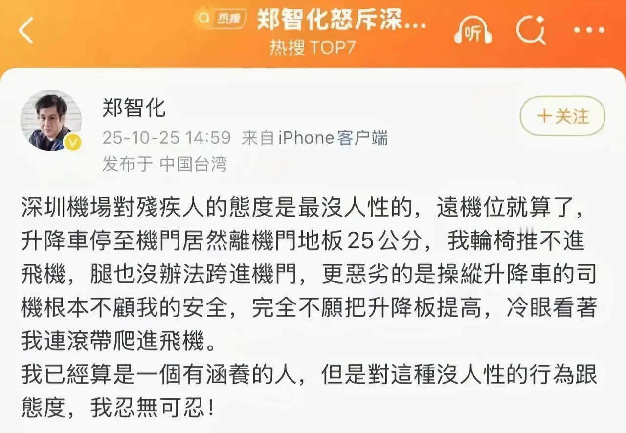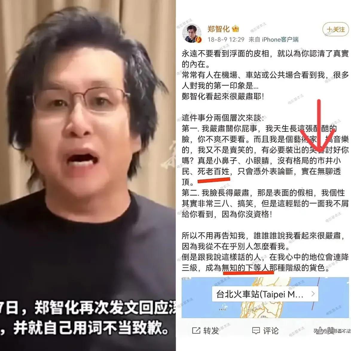 郑智化啊郑智化,亏我那么爱听你的歌。最近的郑智化太任性了,智商严重下降。郑智化最近的言论让喜爱他的歌迷有些失望。机场事件郑智化不妥言论的发酵,令郑智化发文说早想退休了正好就此退休,并感谢大家给他机会退休,他这是有多么想退休啊。郑智化的歌曲当年风靡一时,他的很多作品确实都很励志,想当年大街小巷都在放他的歌,火的简直是一塌糊涂,人们一方面欣赏他作为残疾歌手身残志坚不屈向上的精神,或许郑智化一直觉得歌迷离不开他的歌,一直沉浸在歌迷对他的喜爱中。郑智化的歌确实曾经打动过那个时代的人群,引起某一代人的强烈共鸣,激起人们热爱生活和奋斗的志向。 深航致歉郑智化 郑智化出场费