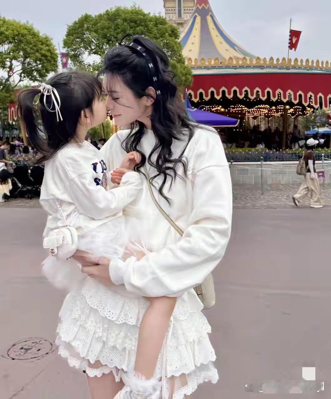 奚梦瑶何猷君一家四口到迪士尼乐园玩,奚梦瑶抱着4岁女儿,两人穿着母女装,看起来好