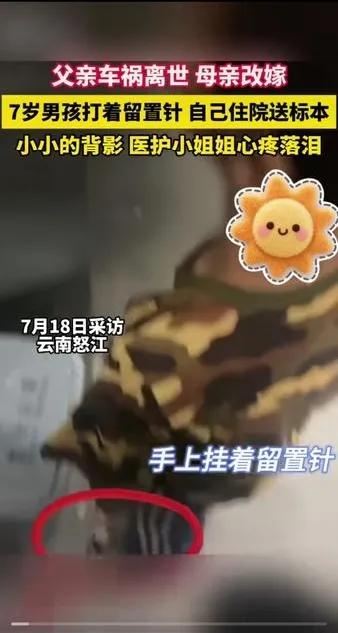 太心酸!云南,医护小姐姐看见一个男孩独自从病房里出来,顺嘴问了一句:“你干嘛去?”男孩说:“把这个给医生。” 医护小姐姐这才看到小男孩打着留置针,明显是个小病人,正准备送标本给医生。看着孤单的男孩,小姐姐问:“你自己一个人去?”小男孩点点头。小姐姐表扬他说:“你太勇敢了。你爸爸妈妈不在吗?” “他们都不要我了。”男孩平静地说,没有一点情绪起伏。小姐姐听到这句话,震惊得说不出话来。正在这个时候,电梯来了,小男孩坐着电梯下了楼。 小男孩走后,医护小姐姐才缓过神来,赶紧追下楼,想帮男孩送标本,可已找不到男孩,她懊恼地跺着脚,心里说不出的心酸和难过。 好在孩子是住院的病人,她一直惦记着这个孩子,工作结束后,找到男孩,告诉他有什么事找自己,并把电话号码留给他。 小男孩刚7岁,爸爸在他1岁多时去世了,妈妈也改嫁了。他和爷爷奶奶还有姑姑一起生活。大概男孩妈妈改嫁时,觉得有一大堆人照顾孩子,才放心走的吧。可是谁照顾,也不如妈妈照顾得周到。 也有人说,大概爷爷奶奶不想让妈妈把孩子带走吧。哪有当妈的舍得扔下孩子。 不管怎么说,没人可以替代母爱,孩子最大的靠山没了,孩子只得独自面对这些困难。孩子刚7岁,正是在父母怀里撒娇的年纪,现在病了,却不得不自己照顾自己。 孩子妈妈有追求自己生活的权力,外人不能谴责她的选择。可孩子呢?虽然一家有一家的难,但再难也应该把孩子带在身边。在他没成年以前,这是妈妈的义务和责任。 特别是孩子生病时,他多么想自己的妈妈。结果他说出“他们不要我了”时,口气那么平静,是对妈妈失望了,还是他已习惯没有妈妈的生活了。 不知妈妈看到这个视频,还能心安理得追求自己的生活吗?