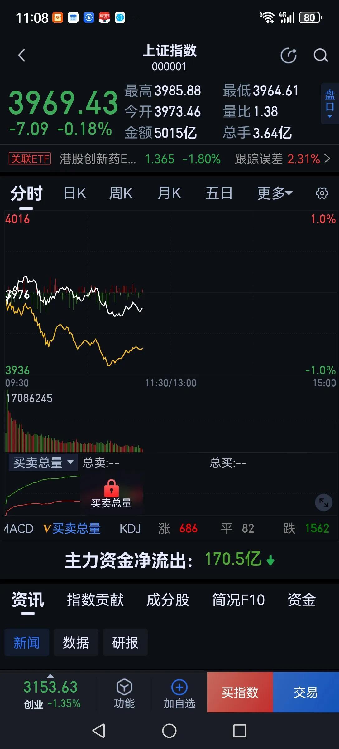 上攻无力,谨防调整。今天上午又上演拉银行护指数跌个股的行情,亏钱效应明显。上攻无