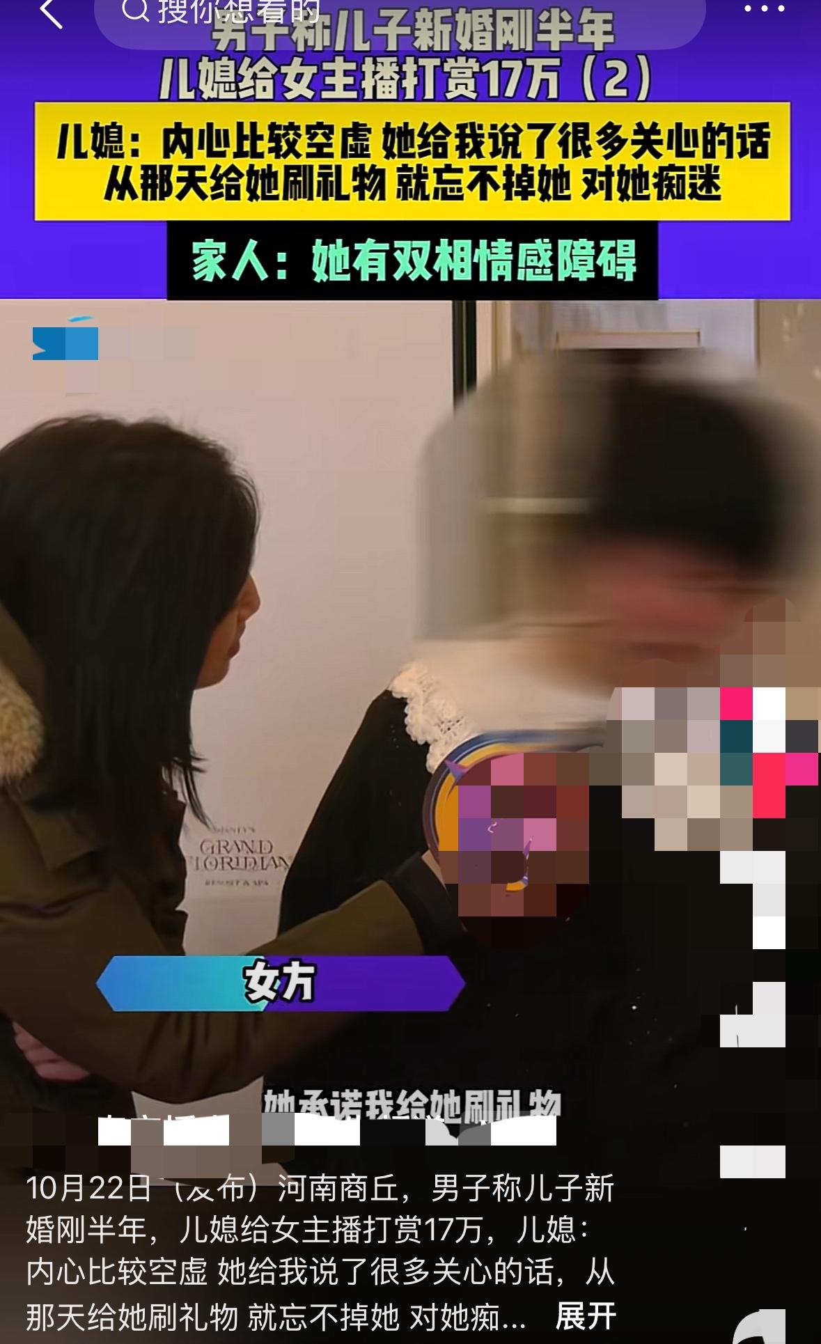 见过男人打赏女主播的,女人打赏女主播上瘾的还真是少见。河南商丘,女子新婚后,打赏女主播170000元,得知原因网友也懵了。 对于年过半百的老人来说,儿子结婚后就该等着抱孙子了,然而对于河南商丘的一位老人来说,儿子结婚后,儿媳的所作所为让他觉得天塌了。 儿子新婚不过半年,本应是夫妻携手开启幸福生活的新篇章,可家里却出了件让人又惊又忧的事儿。 儿媳竟然给一位女主播打赏了高达17万的巨额礼物! 儿媳自己说,她内心一直比较空虚。 在直播里,那位女主播对她关怀备至,说了好多贴心的话,还给她送了一些礼物,让她感受到了前所未有的温暖。 拿着自己的钱,给你送点礼物,结果把你迷倒了,这个说法真是让一众网友都迷糊了。 从第一次给女主播刷礼物开始,她就彻底陷入了痴迷,满脑子都是女主播的身影,怎么都忘不掉。 直到把自己17万的彩礼都刷给了女主播。 这事儿被家里人知道后,女子父亲赶忙带着女儿去看医生。 经过诊断,原来女子患有双相情感障碍。 这种病症让她的情绪和行为都难以自控,或许正是病症的影响,才让她在网络世界里如此冲动地挥霍钱财。 眼看着辛苦积攒的钱就这么打了水漂,家人心急如焚。 无奈之下,他们只好请求媒体介入,希望借助媒体的力量,让女主播归还这笔打赏的钱。 毕竟17万不是个小数目,对一个普通家庭来说,可能是多年的积蓄。 然而,出去的钱怎么可能那么容易找回来呢?这类的钱,怕是不好要回来了。 木言说:网络直播虽然能带来一时的快乐和慰藉,但过度沉迷甚至不惜巨额打赏,实在不可取。 希望这件事能给更多人敲响警钟,关注身边人的情感需求和心理健康,同时也提醒大家在网络消费时要保持理性。
