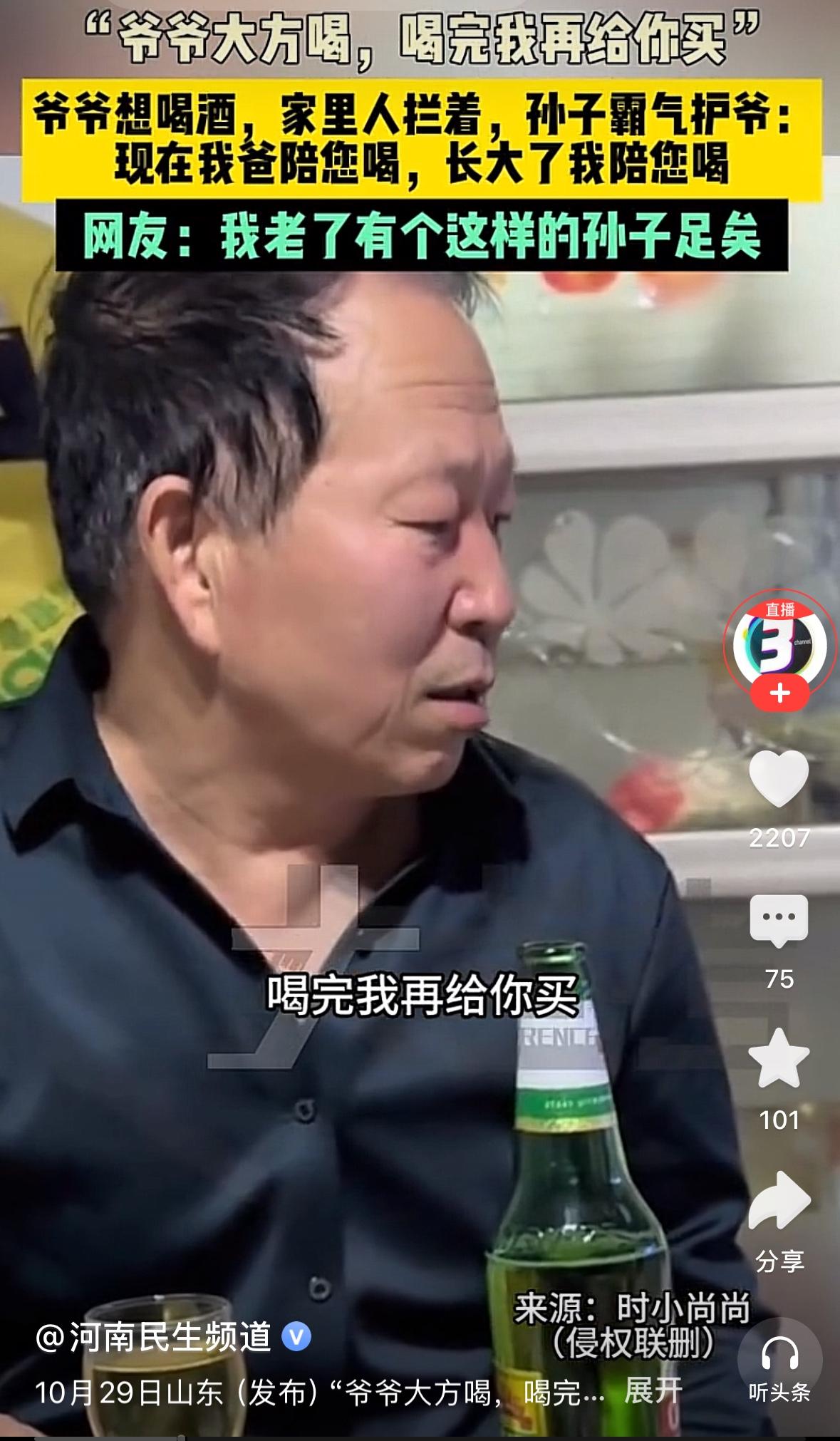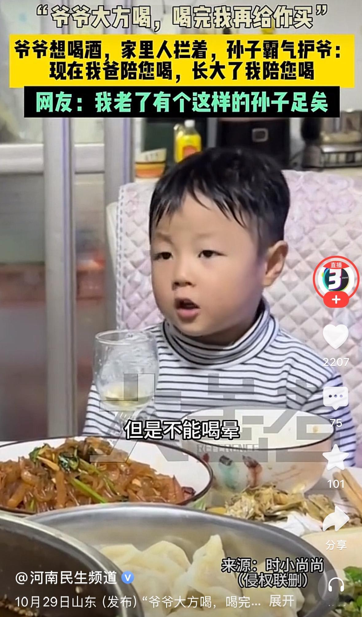 “这个孙子火了。”近日,山东的一家人在吃饭,老人的孙子不卑不亢地说:爷爷大方喝,不够了我去买,现在爸爸陪你喝,长大了我陪你喝。 10月29日,一网友发布的一则温馨视频引发大家的关注。 画面中,爷爷想喝酒,却遭到家里人的阻拦,想来是家人担心爷爷饮酒过量对身体不好。 就在气氛略显紧张之时,可爱的孙子站了出来,他霸气又暖心地护着爷爷,大声说道:“爷爷大方喝,喝完我再给你买”,紧接着还补充道“现在我爸陪您喝,长大了我陪您喝”。 孙子简单的几句话,瞬间让现场氛围变得格外温暖,也让屏幕前的网友们纷纷为之动容。 孙子让爷爷喝酒,还不忘叮嘱爷爷:只要别喝晕乎就行。 别看孙子年龄小,那情商值快拉满了。他没有像家人那样直接阻止爷爷喝酒,而是以一种理解和支持的态度,先让爷爷放宽心去喝,还承诺喝完再买。 有这样懂事且有责任感的孙子,爷爷的晚年生活应该会充满幸福和温馨吧。 网友们纷纷感叹:“我老了有个这样的孙子足矣”。 情商拉满的“孙子”如同一颗璀璨的星星,在亲情的天空中闪耀着独特的光芒,让我们感受到了亲情的珍贵和温暖,也为我们树立了一个孝顺、懂事的好榜样。