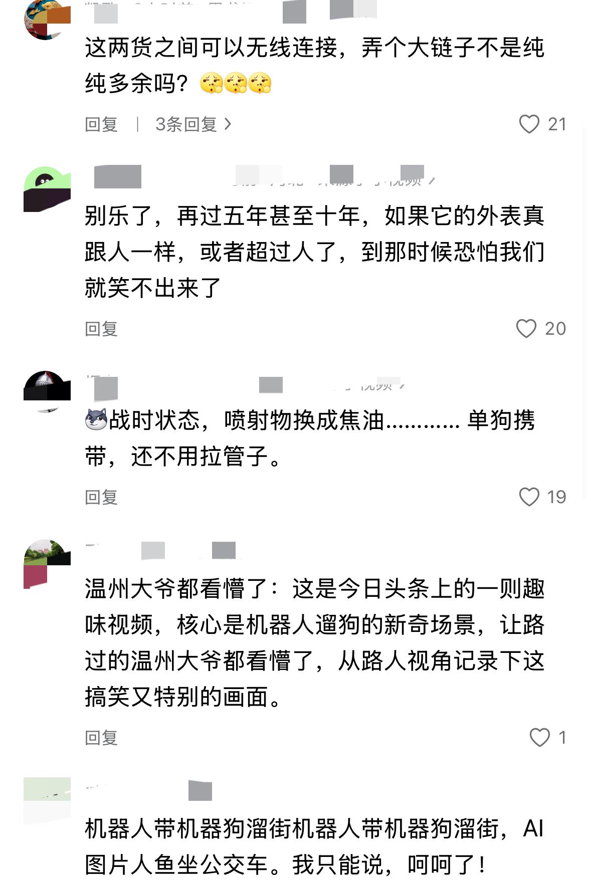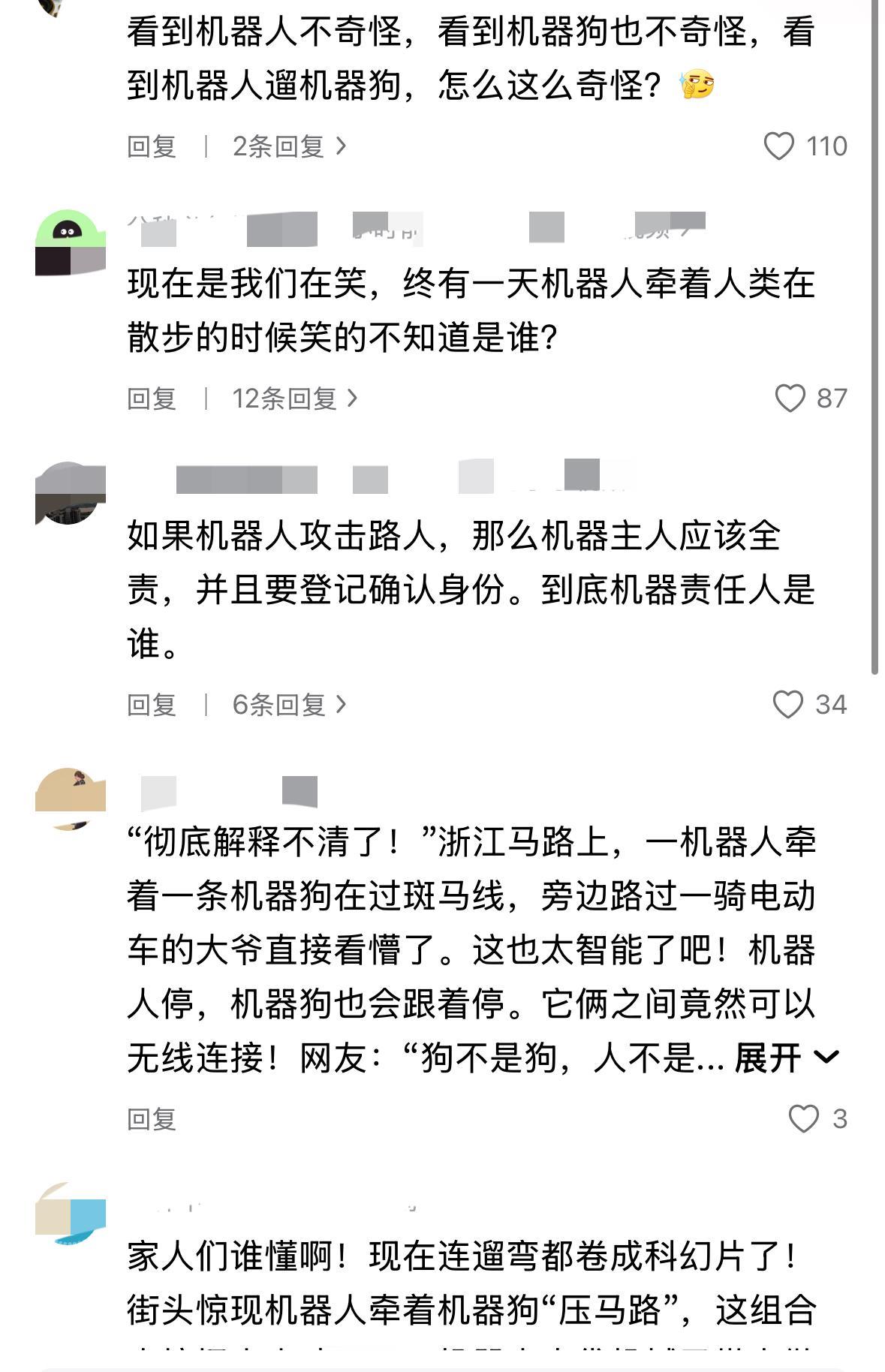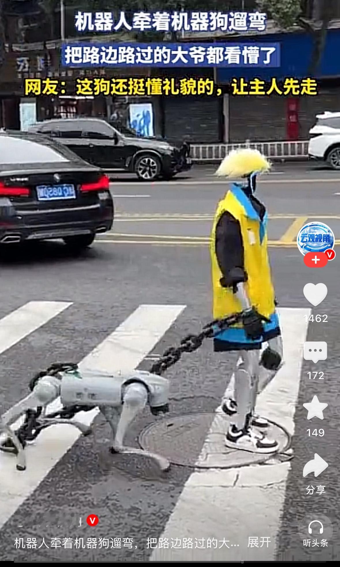 这社会快变成了不认识的样子, 今天刷到一则超有趣的视频, 画面里,一个机器人稳稳地走在前面, 手里还牵着一根“狗绳”, 而绳子的另一端, 竟然是一只活灵活现的机器狗。 这机器狗迈着四条小短腿, 不紧不慢地跟在机器人身后, 那模样,简直萌翻了! 更让人忍俊不禁的是网友们的神评论, 有人打趣说: “这狗还怪有礼貌,让主人先走。” 仔细一瞧,还真有那么点意思, 机器人步伐坚定地向前, 机器狗乖乖地跟在后面, 仿佛真的在遵循着某种“礼仪规范”。 这场景, 就像是从科幻电影里直接搬到了现实街头, 充满了未来感和奇幻色彩。 想象一下,要是以后走在街上, 满眼都是机器人牵着机器狗, 或者机器猫、机器鸟之类的, 那画面简直太“魔幻”了。 科技的发展真是日新月异, 以前只能在想象中出现的东西, 现在正一点点变成现实。 不过,看着这机器人和机器狗的组合, 我还是忍不住感叹: 这个世界快疯癫成我不认识的样子了。